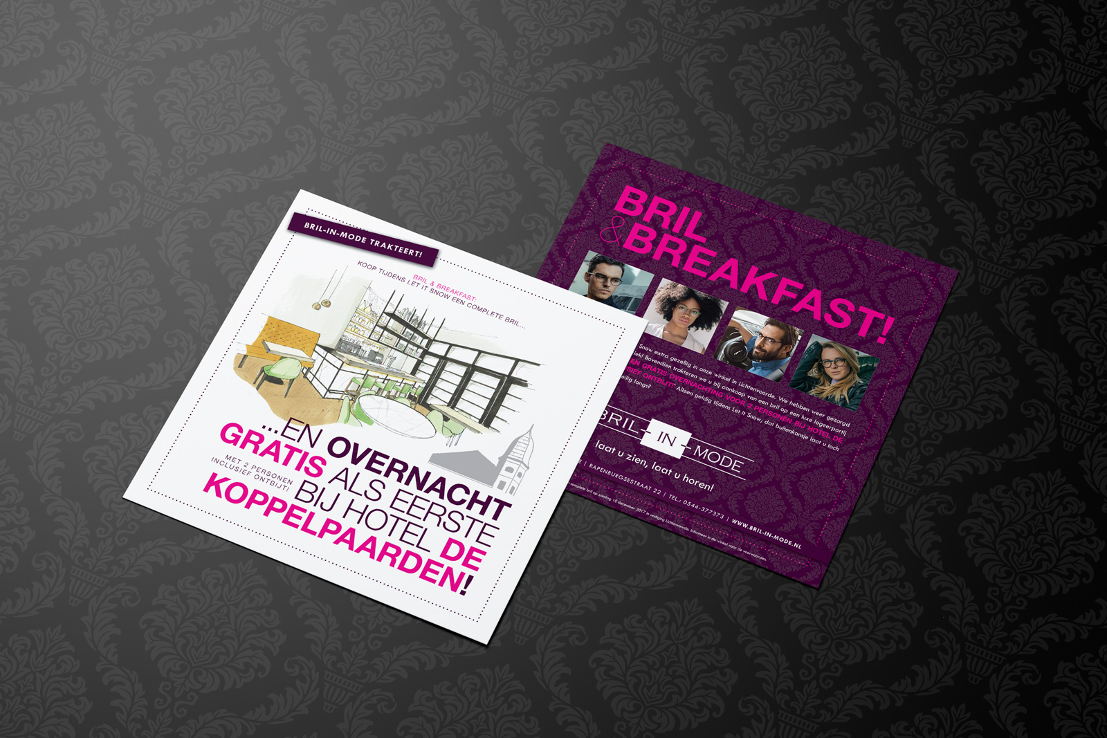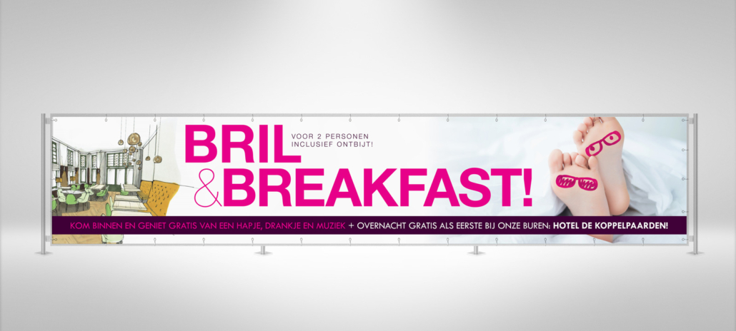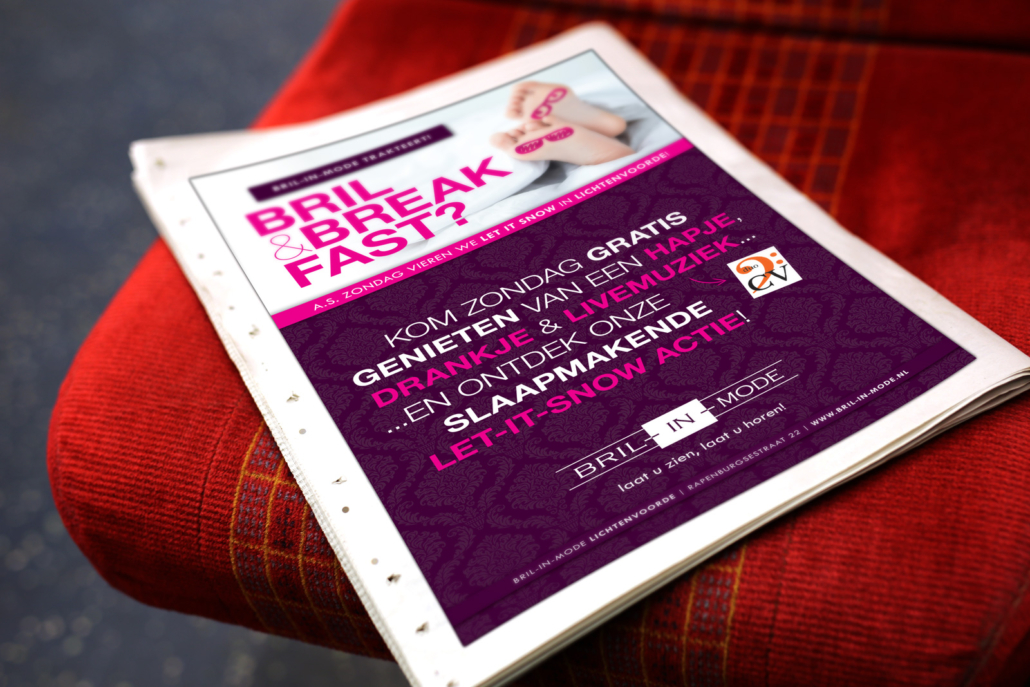 Op iedere eerste koopzondag na Sinterklaas viert heel Lichtenvoorde ‘Let it Snow’. En snowen deed het dit jaar! Bril-in-Mode deed ook weer mee en trakteerde iedere brilkoper op een overnachting bij het gloednieuwe hotel De Koppelpaarden, tevens buren! Daarnaast was er voor iedereen een hapje, drankje en live-muziek. lekker in vorm maakte alle campagne-items, waaronder een flyer, gevelbanner, stoepbordposter, dinercheque en advertentie. Ook via Facebook werd iedereen uitgenodigd om te delen in de feestvreugde.
