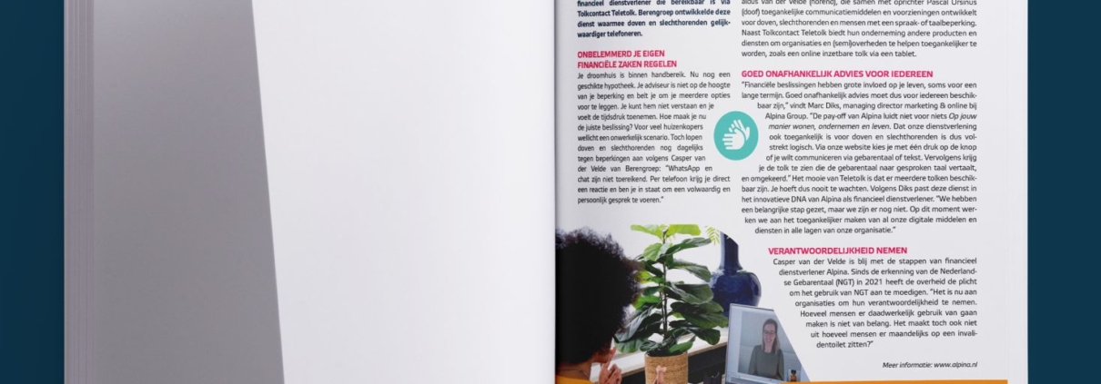 Alpina is de eerste financieel dienstverlener die bereikbaar is via Tolkcontact Teletolk, een dienst waarmee doven en slechthorenden gelijkwaardiger telefoneren via een videotolk. Bij lekker in vorm mochten een advertorial opmaken en redigeren over dit mooie nieuws, bestemd voor plaatsing in onder andere New Financial Magazine van New Financial Forum.