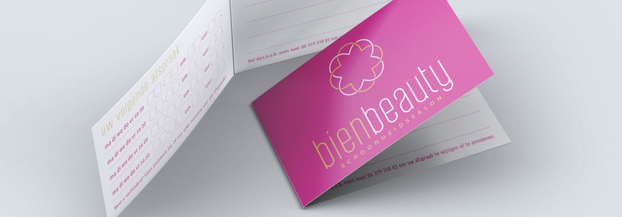 Als reminder krijgen klanten van schoonheidssalon Bien Beauty een afsprakenkaartje mee naar huis, met daarop alle contactgegevens en de datum van hun volgende afspraak. lekker in vorm maakte het ontwerp, waarna het kaartje gedrukt werd op ice silver metallic papier. Zo krijgt het ontwerp een passend sprankelende look, maar blijft het kaartje toch makkelijk beschrijfbaar.