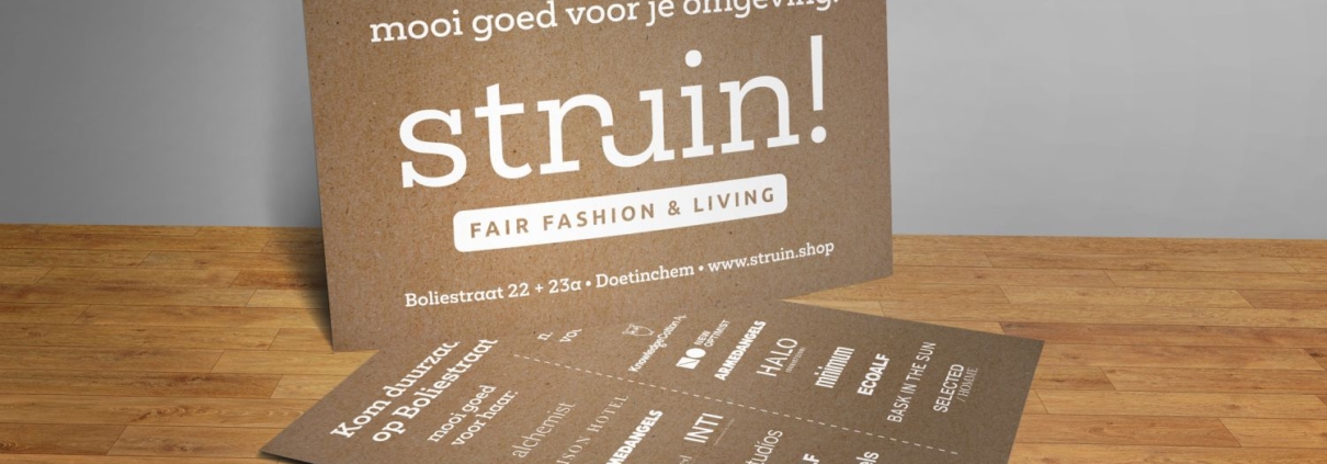 Of je struint voor haar of voor hem, bij struin! fair fashion + living vind je altijd volop mooi en duurzame merken. Bij lekker in vorm mochten we een gecombineerde strooiflyer op kraftpapier ontwerpen die dat in één oogopslag laat zien. Geen lange verhalen, maar een krachtig overzicht van alle logo’s. Zo ontdek je snel de merken die struin! te bieden heeft – stijlvol, duurzaam en lokaal.