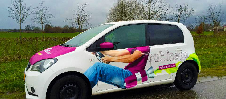 Sinds deze week rijden onze nieuwe buren van Outliners rond met een opvallende autobelettering. lekker in vorm mocht het ontwerp verzorgen voor de webspecialisten, aansluitend op hun pay-off “niet bekeken, maar gezien worden”.