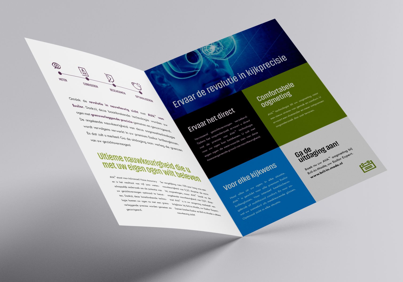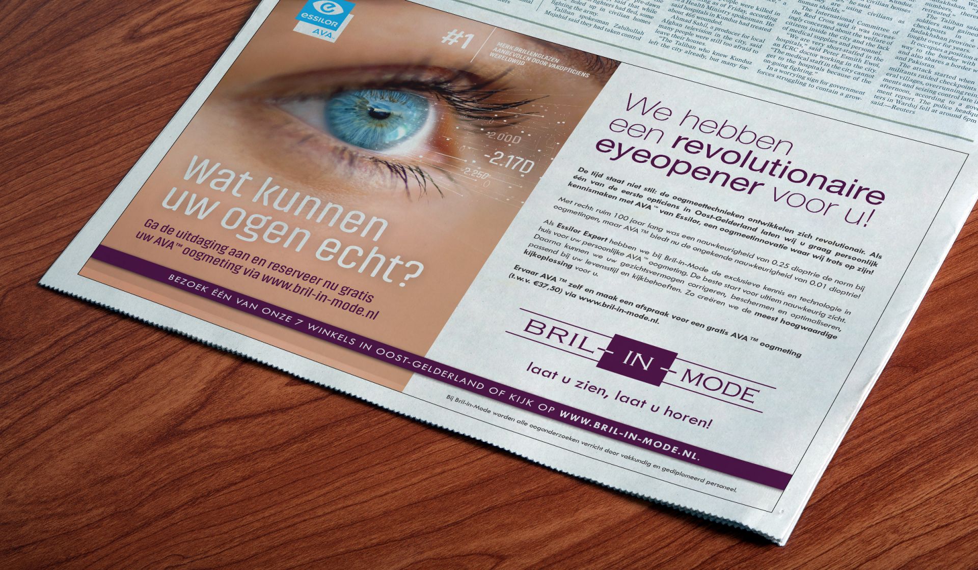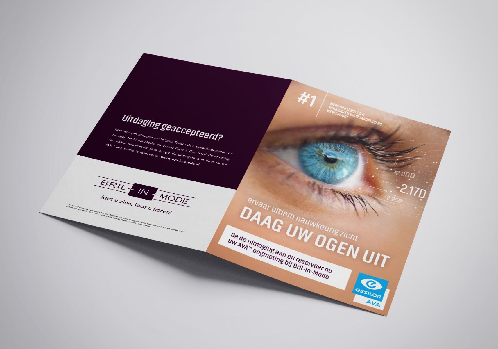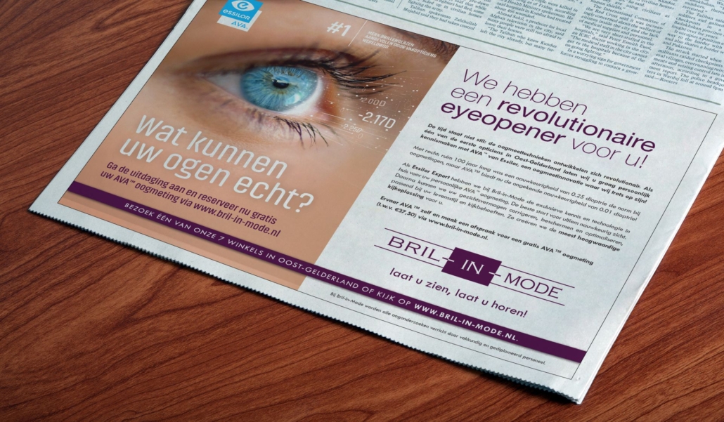 Wat kunnen je ogen echt? Als één van de eerste opticiens in Oost-Gelderland laat Bril-in-Mode je graag kennismaken met AVA™ van Essilor: een revoloutionaire oogmeetinnovatie. Bij lekker in vorm mochten we daarom een campagne ontwikkelen, aansluitend op de landelijke Essilor campagne maar tegelijkertijd met een herkenbaar Bril-in-Mode gevoel. We mixten daarvoor de diverse huisstijlelementen van Essilor en Bril-in-Mode samen tot een mooi geheel.