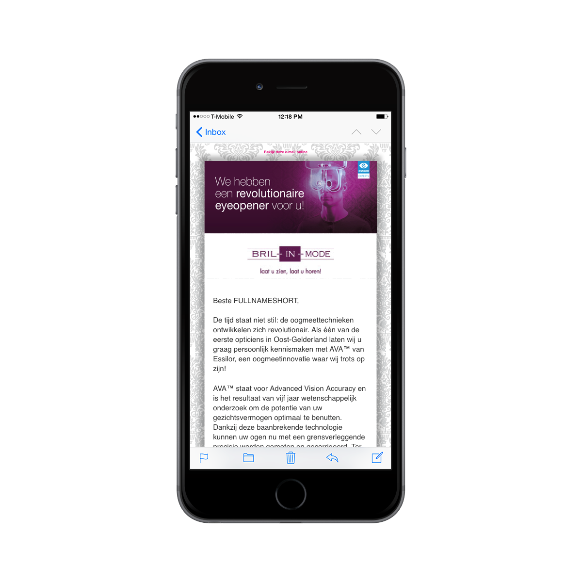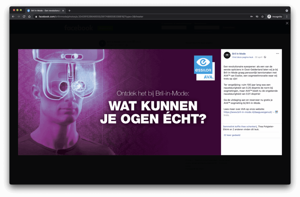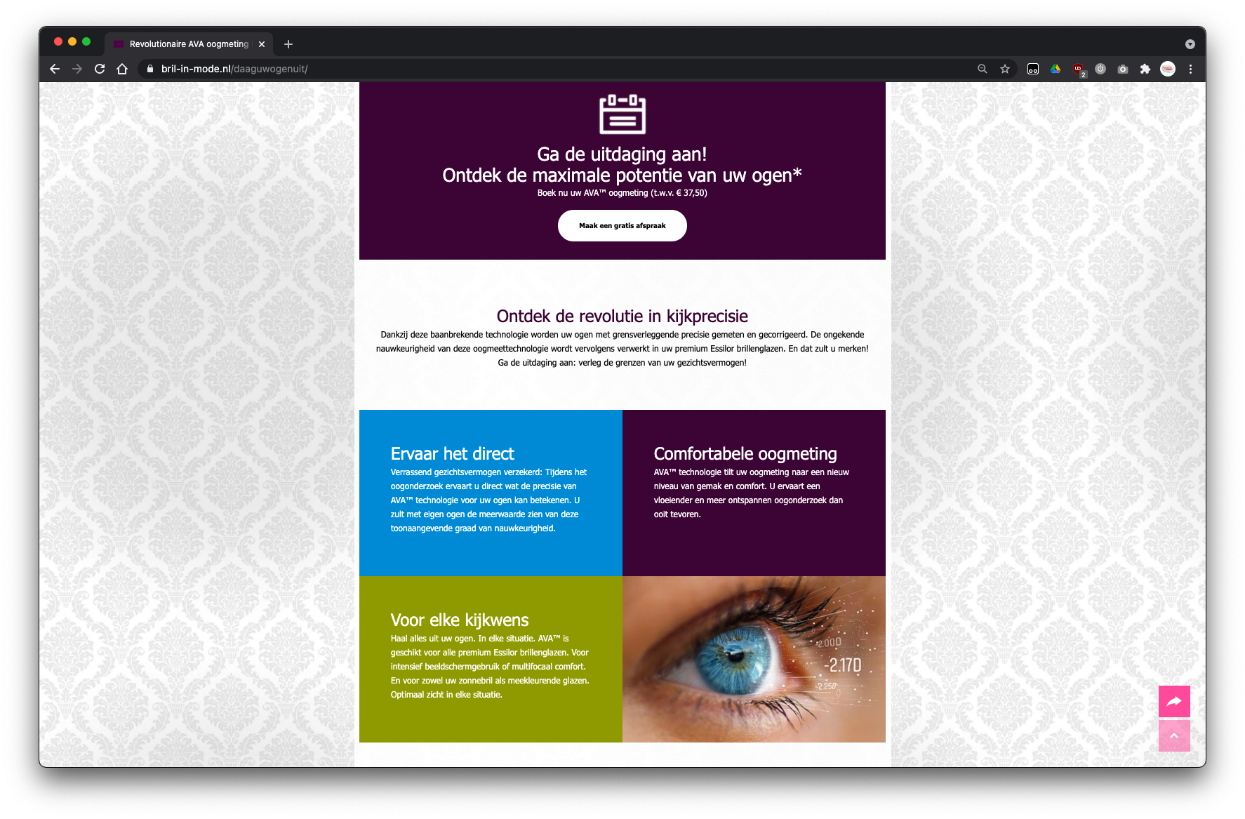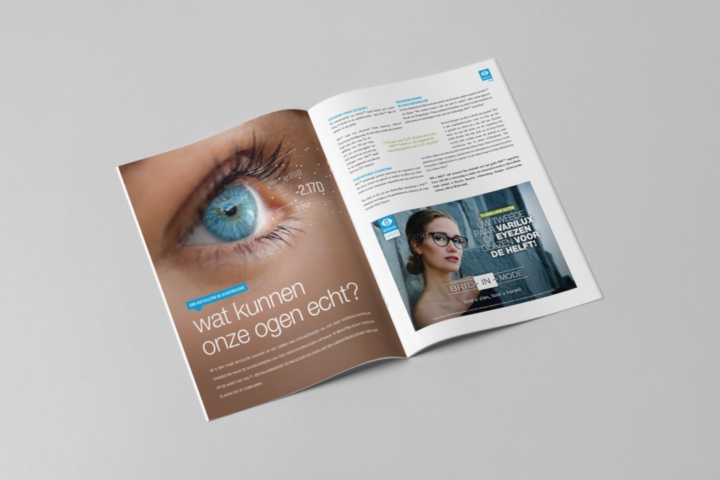 Wat kunnen je ogen echt? Als één van de eerste opticiens in Oost-Gelderland laat Bril-in-Mode je graag kennismaken met AVA™ van Essilor: een revoloutionaire oogmeetinnovatie. Bij lekker in vorm mochten we daarom een campagne ontwikkelen, aansluitend op de landelijke Essilor campagne maar tegelijkertijd met een herkenbaar Bril-in-Mode gevoel. We mixten daarvoor de diverse huisstijlelementen van Essilor en Bril-in-Mode samen tot een mooi geheel.