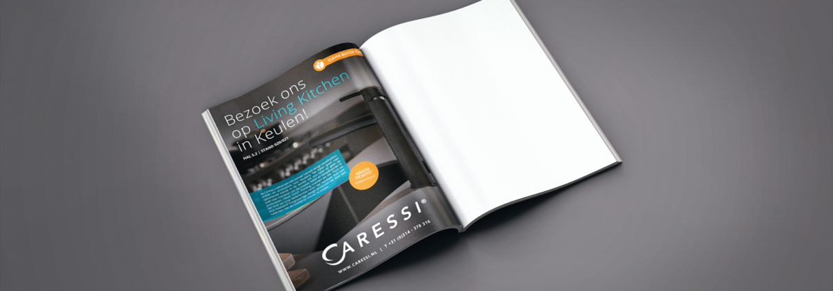 Caressi staat met een mooie stand op Living Kitchen in Köln. Om mensen uit te nodigen voor een bezoek, ontwierpen we bij lekker in vorm een reeks vakbladadvertenties in diverse formaten en talen.
