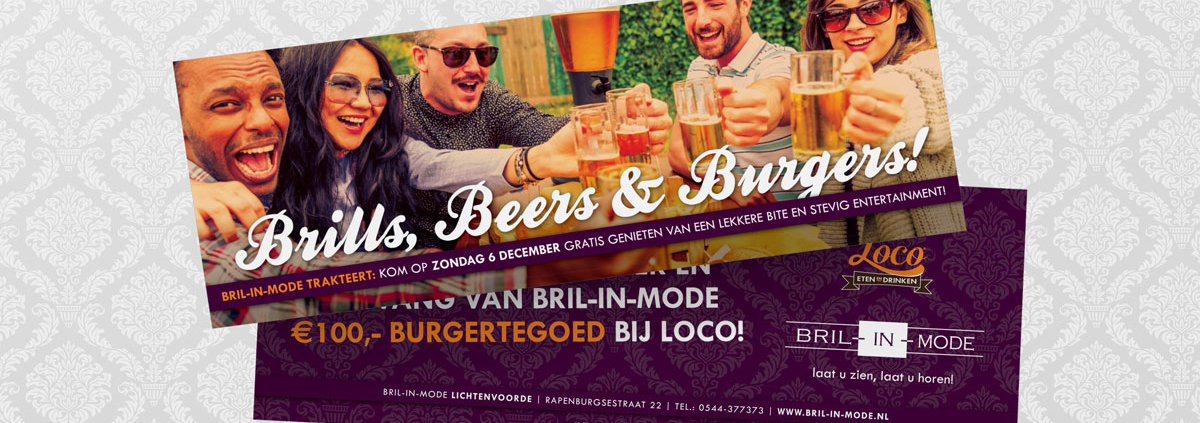 Op Kerstklokkenzondag in Lichtenvoorde trakteert Bril-in-Mode iedere kopende klant op €100,- burgertegoed bij lokaal restaurant Loco. Daarnaast zijn er voor iedereen Brills, Beers & Burgers onder begeleiding van live-muziek. lekker in vorm maakte alle campagne-items, waaronder een flyer, gevelbanner, stoepbordposter en dinercheque.