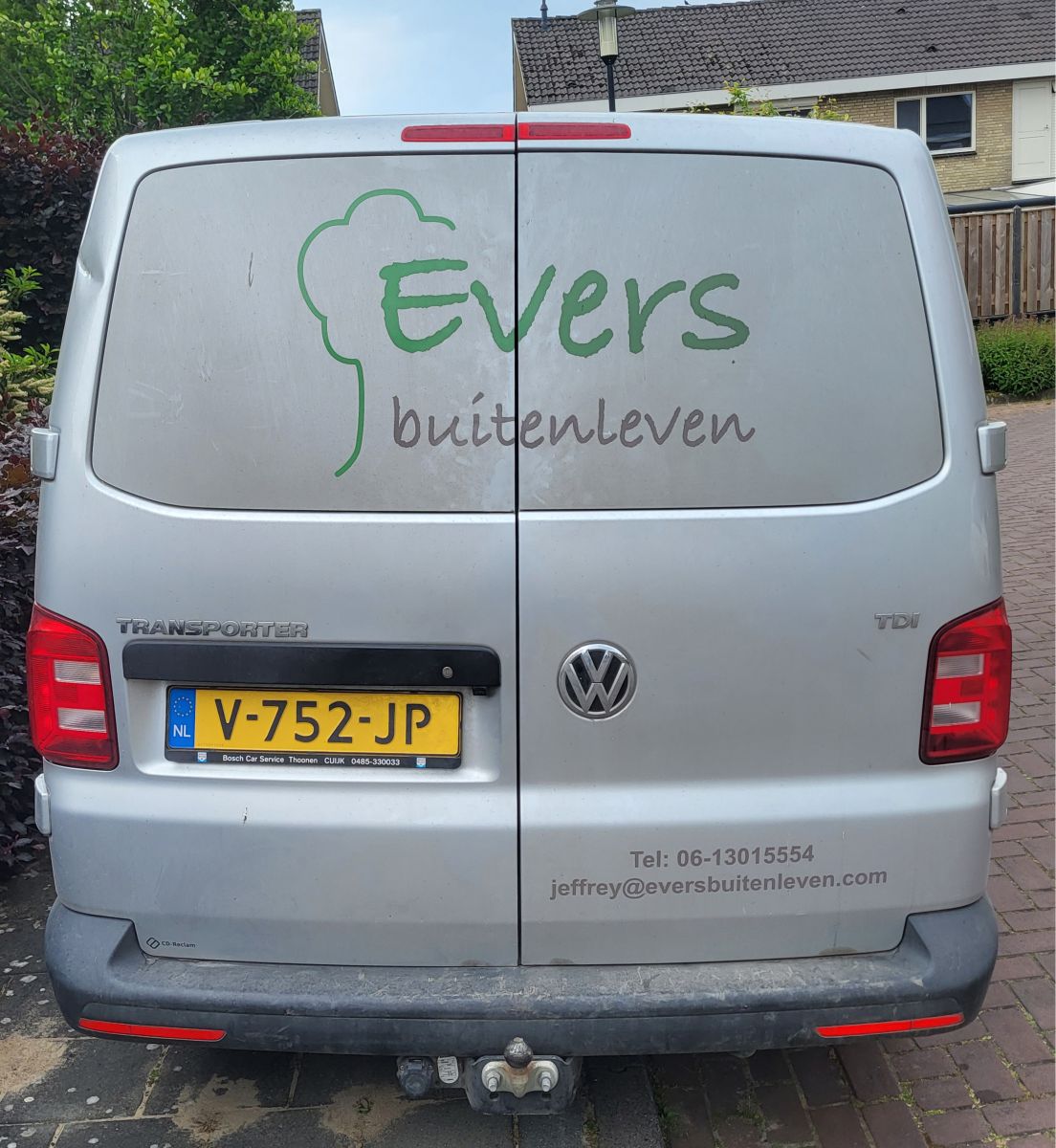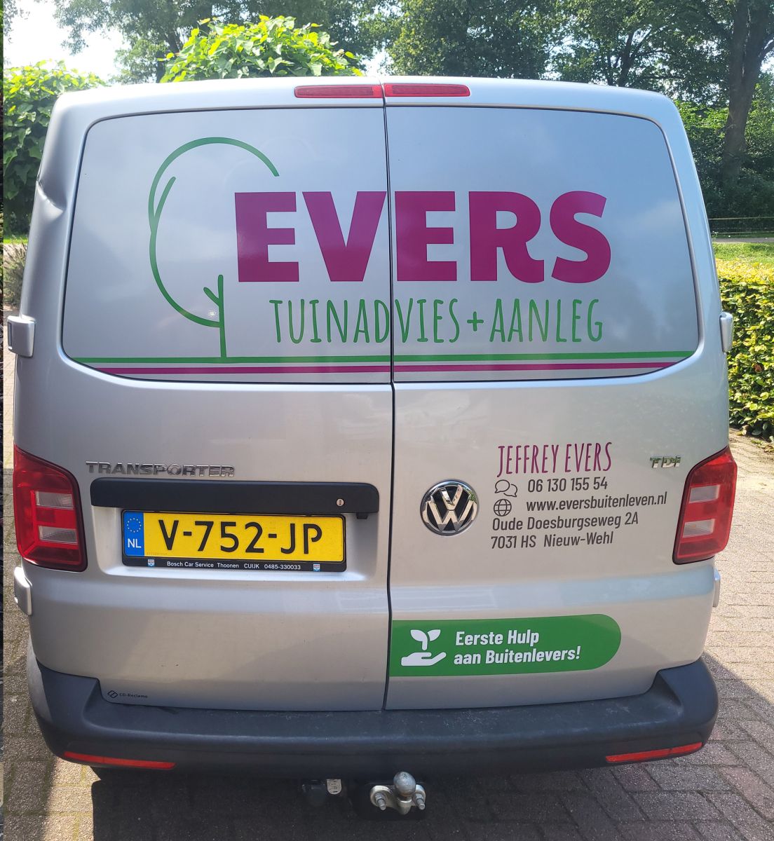 Heb jij Jeffrey al gespot met zijn nieuwe busbelettering in Wehl en omstreken? Want ook de Volkswagen Transporter van zijn hoveniersbedrijf Evers Buitenleven kon natuurlijk niet achterblijven in de restyling van de nieuwe huisstijl.