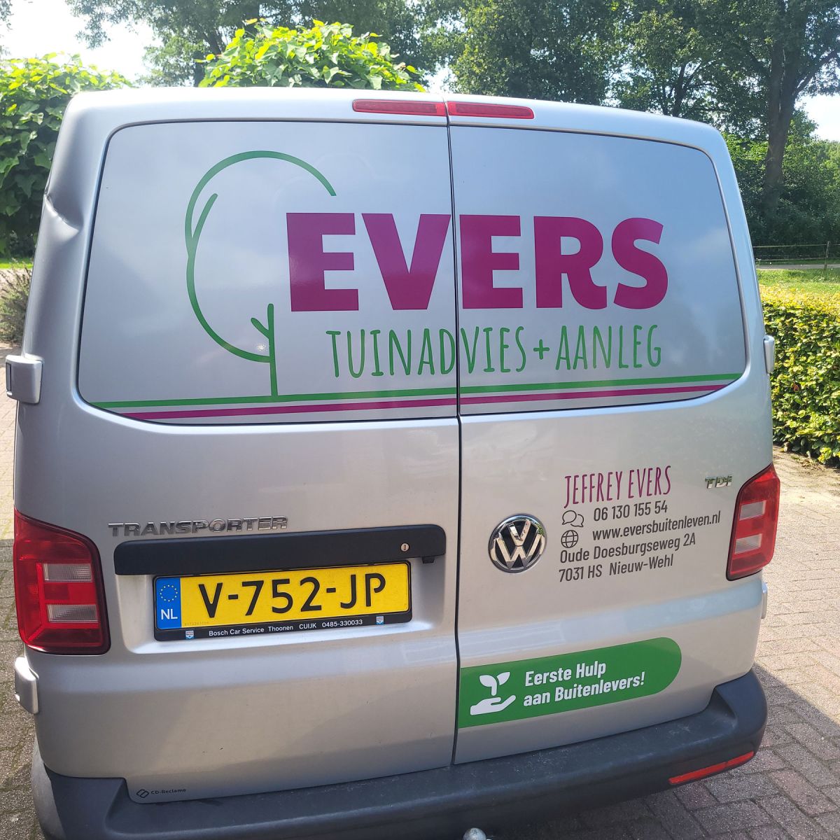 Heb jij Jeffrey al gespot met zijn nieuwe busbelettering in Wehl en omstreken? Want ook de Volkswagen Transporter van zijn hoveniersbedrijf Evers Buitenleven kon natuurlijk niet achterblijven in de restyling van de nieuwe huisstijl.