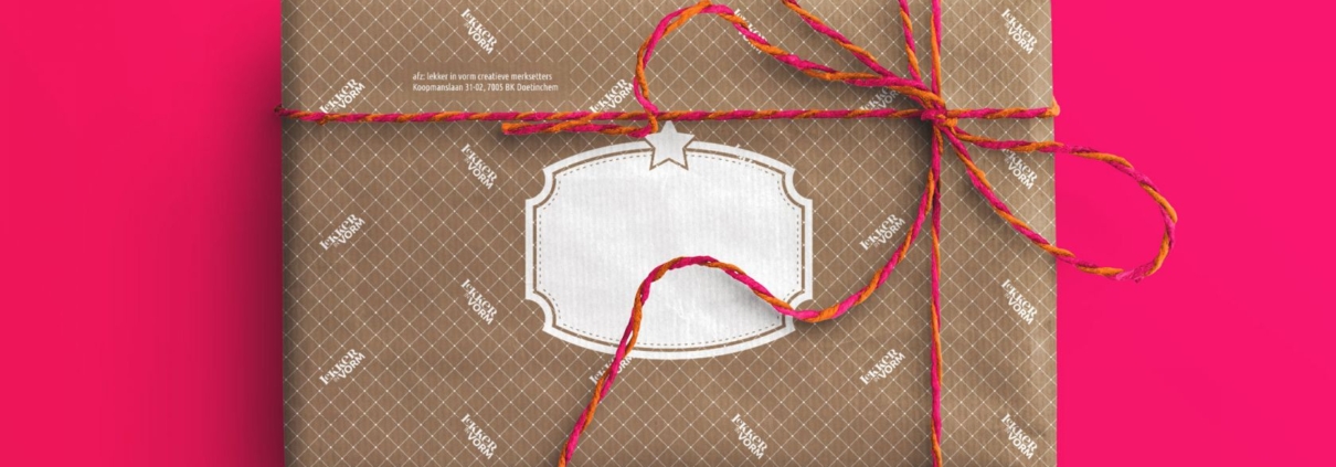 Speciaal voor een cadeautje aan klanten hebben we bij lekker in vorm inpakpapier op kraftpapier ontworpen, bedrukt met witte inkt. Dankzij het ontwerp op maat komen het afzendadres en het label voor verzendgegevens precies op de juiste plek na inpakken.