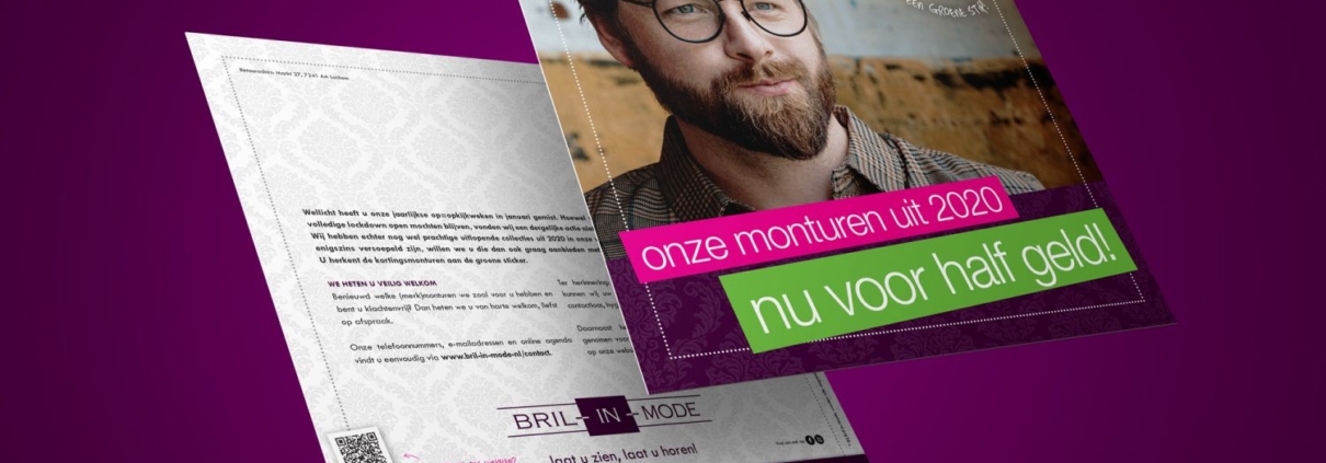 Vanwege Covid-19 zag Bril-in-Mode dit jaar af van haar jaarlijkse op=opkijkweken in januari. Nu de maatregelen weer enigszins versoepeld zijn, biedt ze haar prachtige uitlopende collecties uit 2020 graag alsnog aan met 50% korting! Bij lekker in vorm verzorgden we de campagne die o.a. bestaat uit een direct mailingkaart naar vaste klanten, email nieuwsbrief (edm), social media en divers pos materiaal in en om de winkel. Om het maken van een afspraak makkelijker te maken personaliseerden we alle stoepbordposters met de contactgegevens van de desbetreffende winkel.