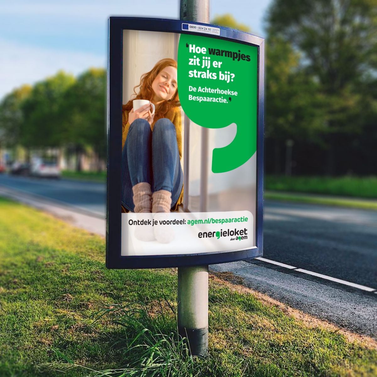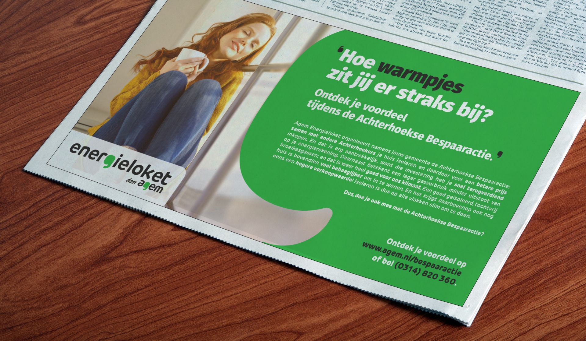 Agem Energieloket organiseert namens diverse gemeentes de Achterhoekse Bespaaractie: samen met andere Achterhoekers je huis isoleren en daardoor voor een betere prijs inkopen. Bij lekker in vorm mochten we qua tekst en beeld meehelpen aan de realisatie van de bijbehorende campagne, in de vorm van onder andere een informatiebrochure per gemeente, een advertentie en outdoor posters.