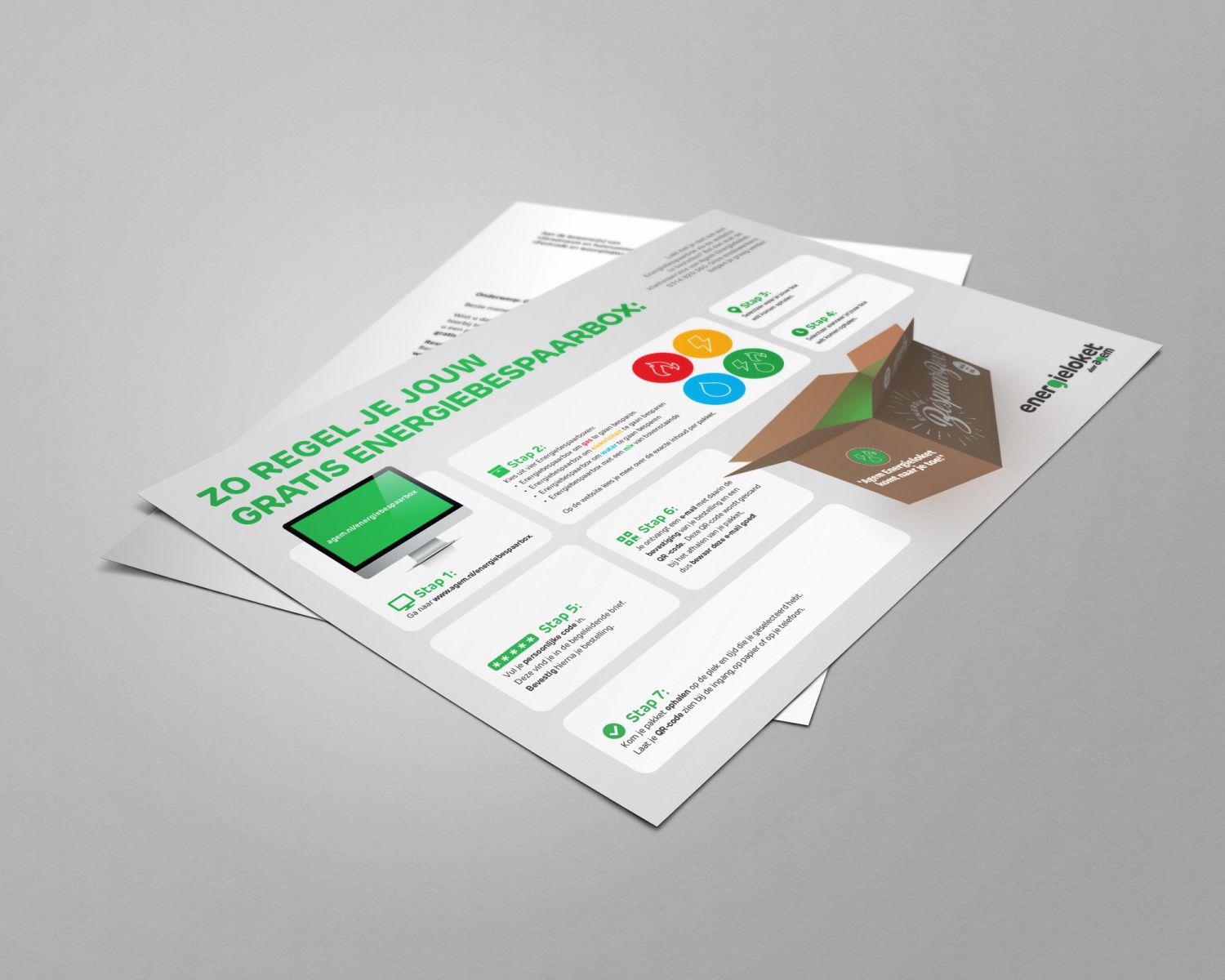 Bij lekker in vorm ontwikkelden we hiervoor een laagdrempelige campagne, bestaande uit: een teaserkaart (DM) in een envelop van de gemeente of verhuurder, een opvolgende brief met uitleg vanuit de gemeente of verhuurder, 4 EnergieBespaarBoxen met stickers die refereren aan de inhoud, plus diverse items om het ophaalmoment van de box mee aan te kleden.