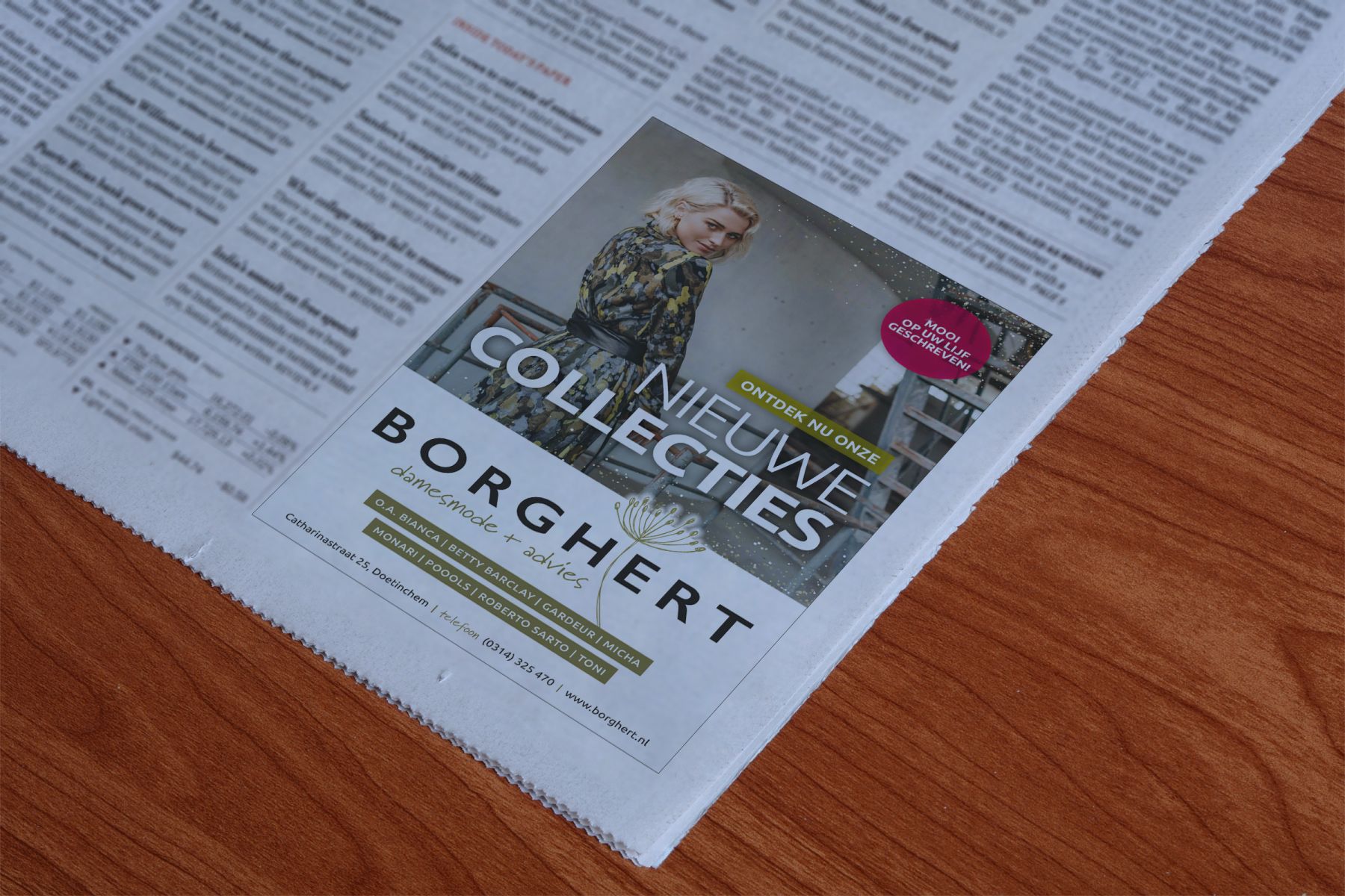 Borghert damesmode + advies heeft mooie nieuwe najaarscollecties ingekocht; vol warme natuurtonen zoals camelbruin, olijfgroen en gebrand oranje. Om iedereen uit te nodigen deze prachtige items te komen bekijken en passen, mochten we bij lekker in vorm een sfeervolle campagne ontwikkelen in de vorm van een uitnodiging via direct mail aan vaste klanten, een advertentie in de Doetinchemmer en een wervende stoepbordposter voor de deur.