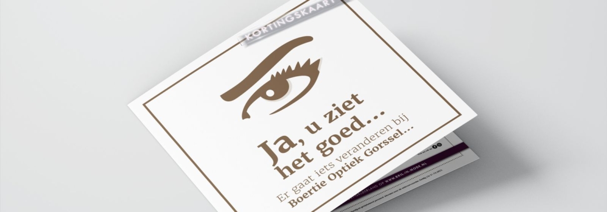 Boertie Optiek Gorssel gaat vanaf volgend jaar verder onder de vlag van Bril-in-Mode. Om vaste klanten hiervan op de hoogte te brengen, ontwierpen we bij lekker in vorm een dubbele direct mailingkaart met sluitsticker. De buitenzijde maakten we op in voor de klant herkenbare Boertie Optiek huisstijl met een fijne kortingsactie. De binnenzijde introduceert het merk Bril-in-Mode in tekst en beeld. Daarnaast ontwikkelden we een stoepbordposter om ook voorbijgangers in Gorssel op de hoogte te stellen. Alvast welkom bij de groep, Bril-in-Mode Gorssel!