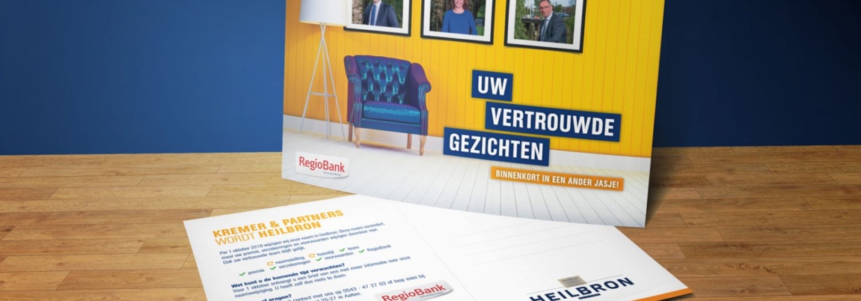 Kremer & Partners is een gevestigde naam in Aalten en omstreken. Toch zal het voor de meeste mensen niet als een verrassing komen dat deze naam gewijzigd wordt in Heilbron: er is immers al jarenlang een hechte samenwerking tussen de twee teams. Bij lekker in vorm mochten we de de naamswijziging wereldkundig maken. Allereerst via een gepersonaliseerde ansichtkaart naar vaste klanten, vervolgens via een tweetal advertenties. Eerst herkenbaar in de huisstijl van Kremer & Partners, daarna hetzelfde concept in een Heilbron jasje.