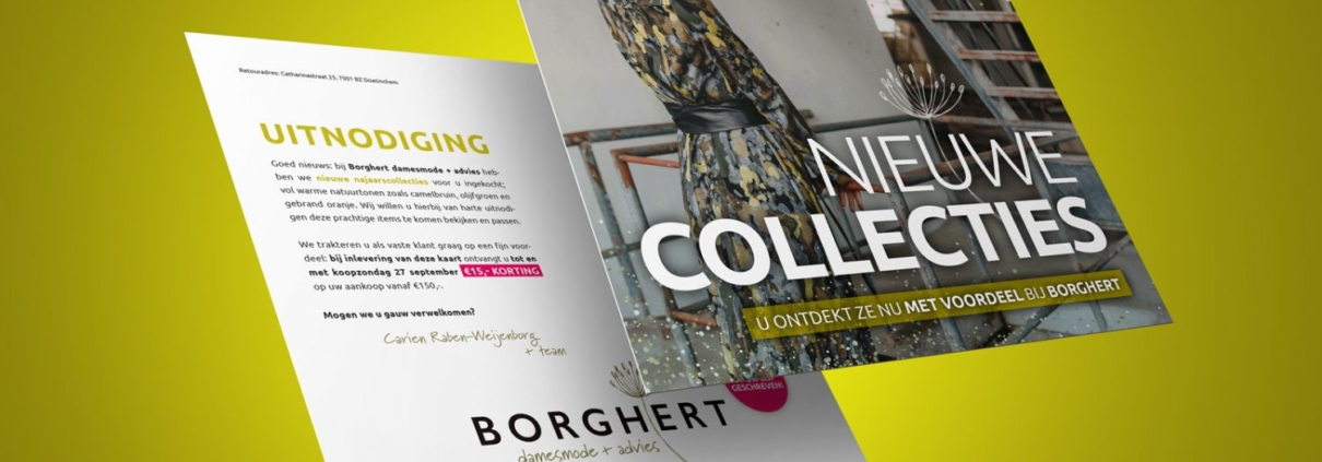 Borghert damesmode + advies heeft mooie nieuwe najaarscollecties ingekocht; vol warme natuurtonen zoals camelbruin, olijfgroen en gebrand oranje. Om iedereen uit te nodigen deze prachtige items te komen bekijken en passen, mochten we bij lekker in vorm een sfeervolle campagne ontwikkelen in de vorm van een uitnodiging via direct mail aan vaste klanten, een advertentie in de Doetinchemmer en een wervende stoepbordposter voor de deur.