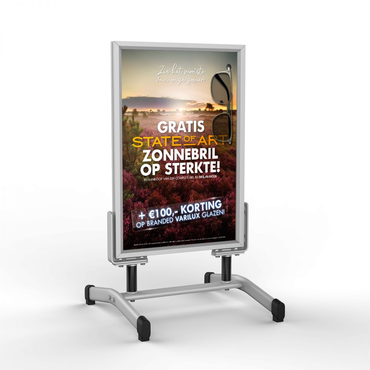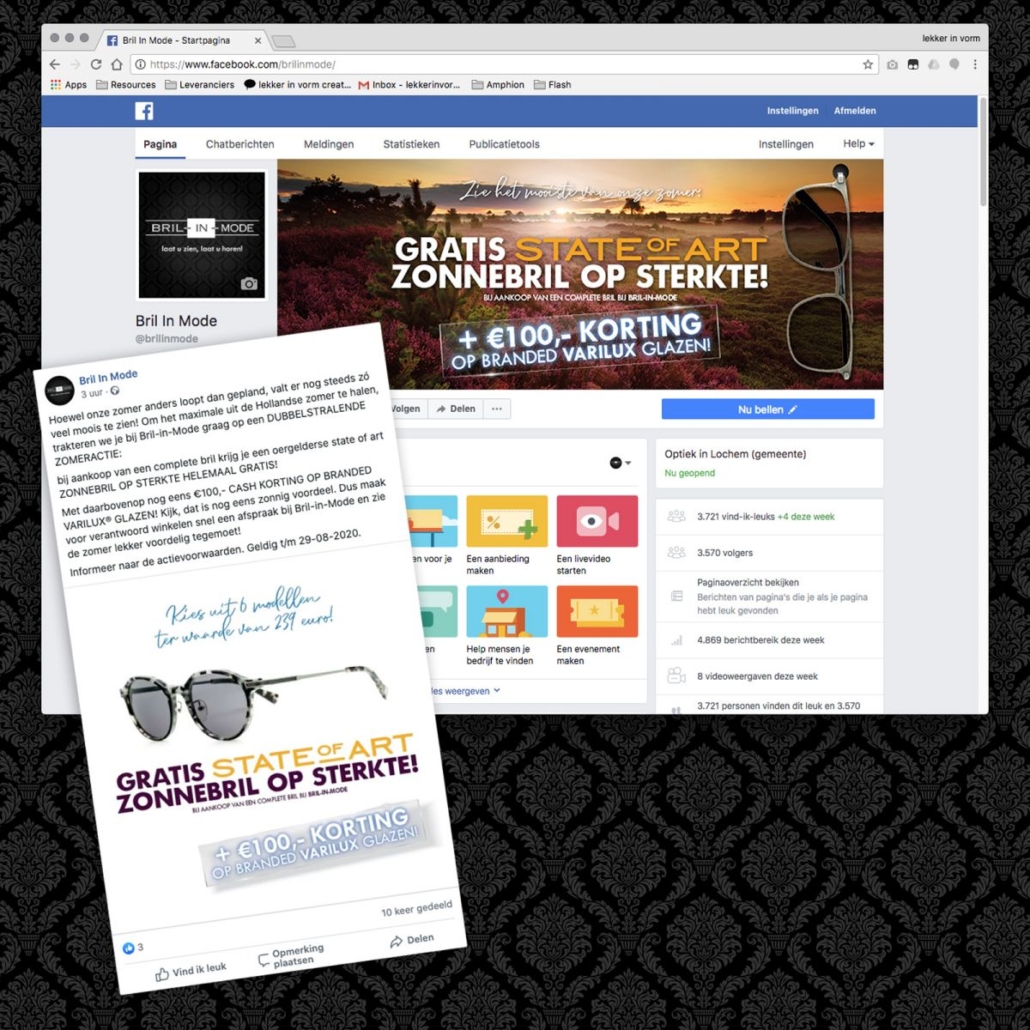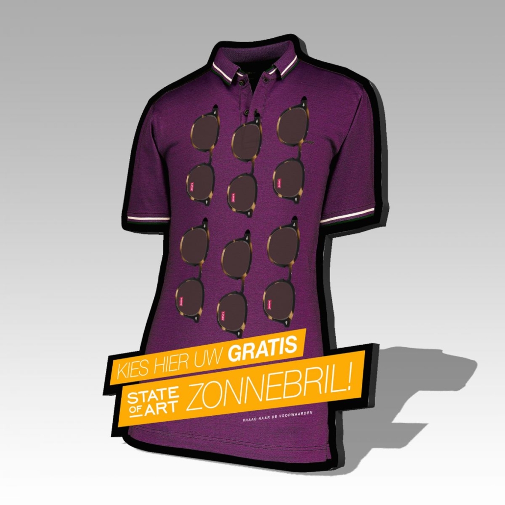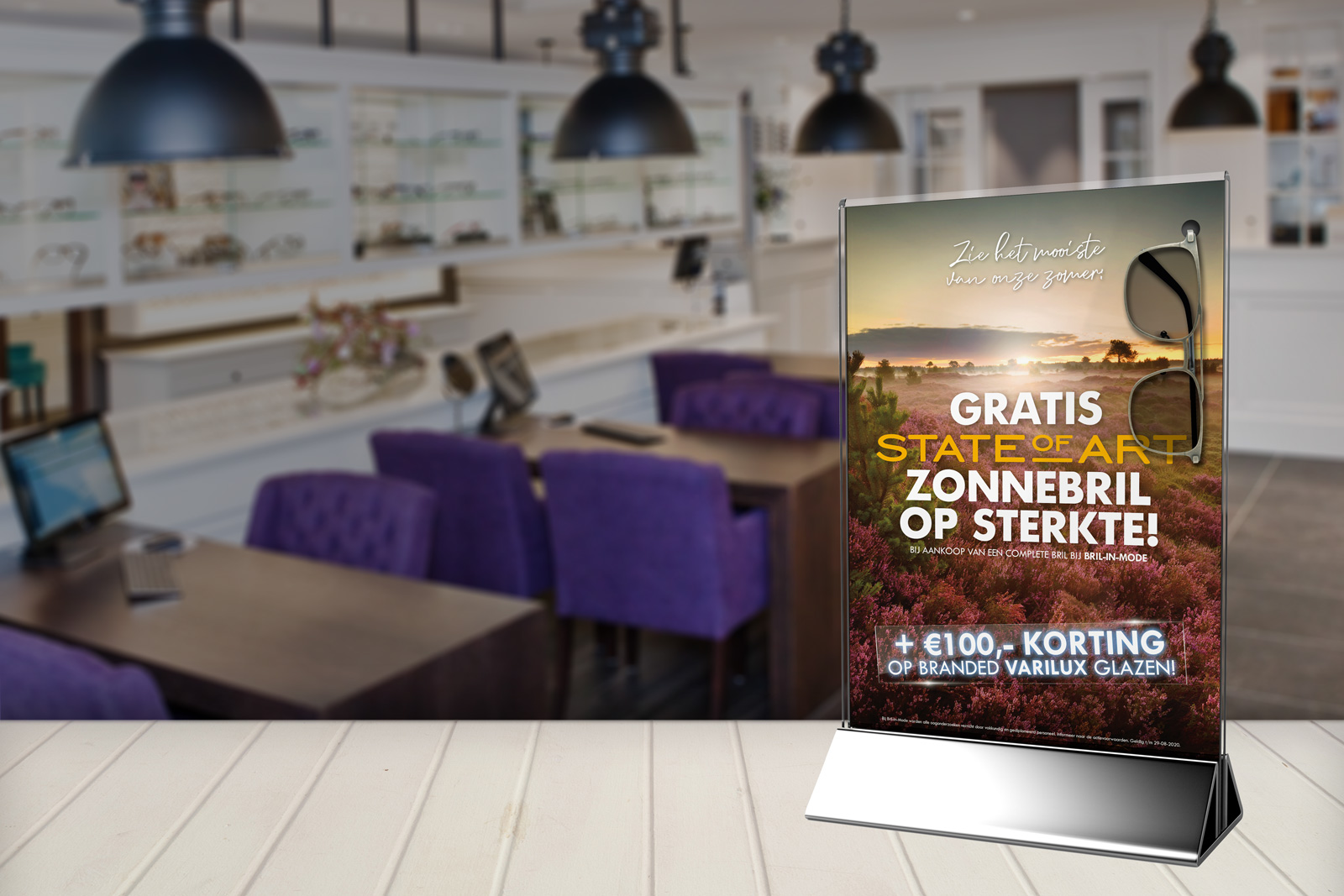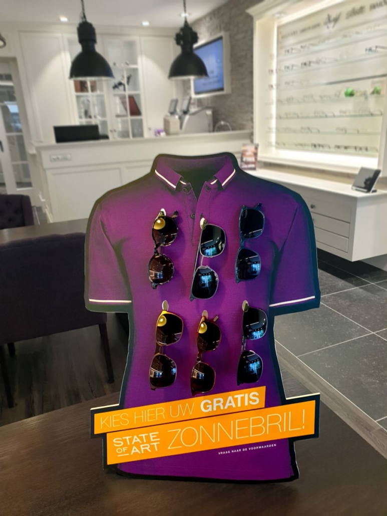 Bij lekker in vorm ontwierpen we deze actiematige zomercampagne met lokale sfeer, bestaande uit een huis-aan-huis flyer, een lokale advertentie in een couponnenboekje en diverse items in en rondom de winkel en online. Speciaal voor het etaleren van de zonnebrillen waaruit je gratis kunt kiezen, ontwierpen we een contourgesneden forex display voor in elke winkel. In elk van de zes gaten kan het pootje van een pasmodel gestoken worden.
