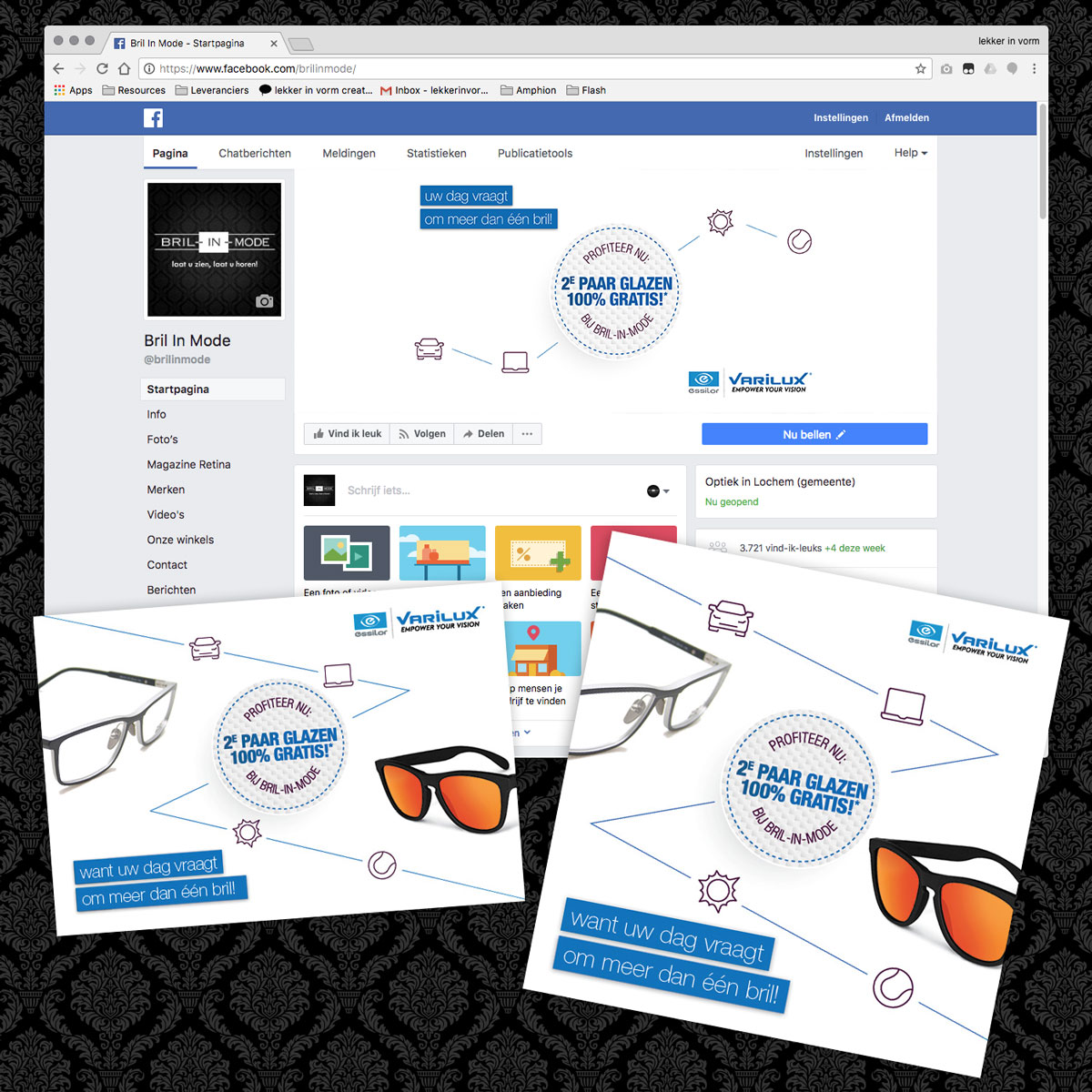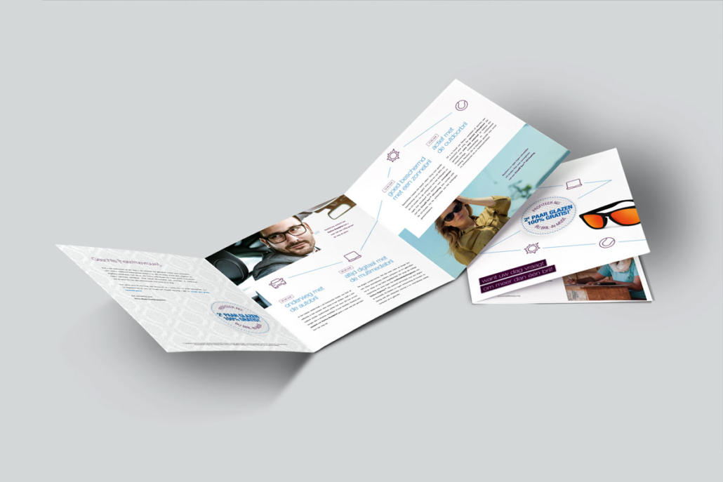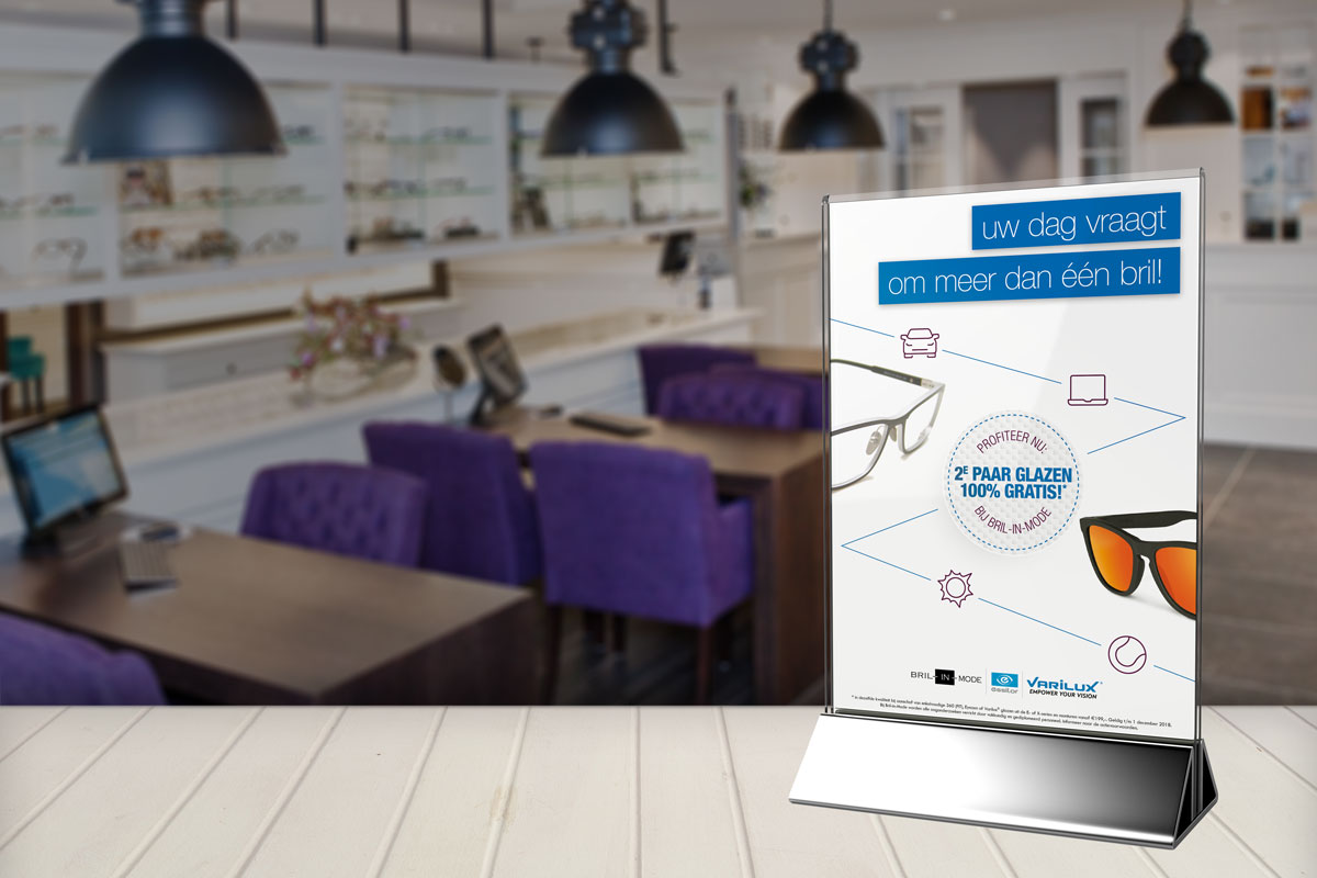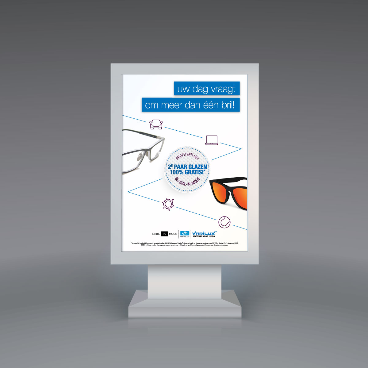 De reclamecampagne met de titel “Uw dag vraagt om meer dan één bril” loopt in lijn met de landelijke Essilor campagne en wordt onder de aandacht gebracht via onder andere een direct mailing naar vaste klanten en huis-aan-huis flyers met een opvallende kruisslag vouw. Deze mailingen worden ondersteund door diverse point-of-sale items in de winkel en op het web. Hierboven valt ook de bijbehorende reclamespot voor de regionale radio te beluisteren.