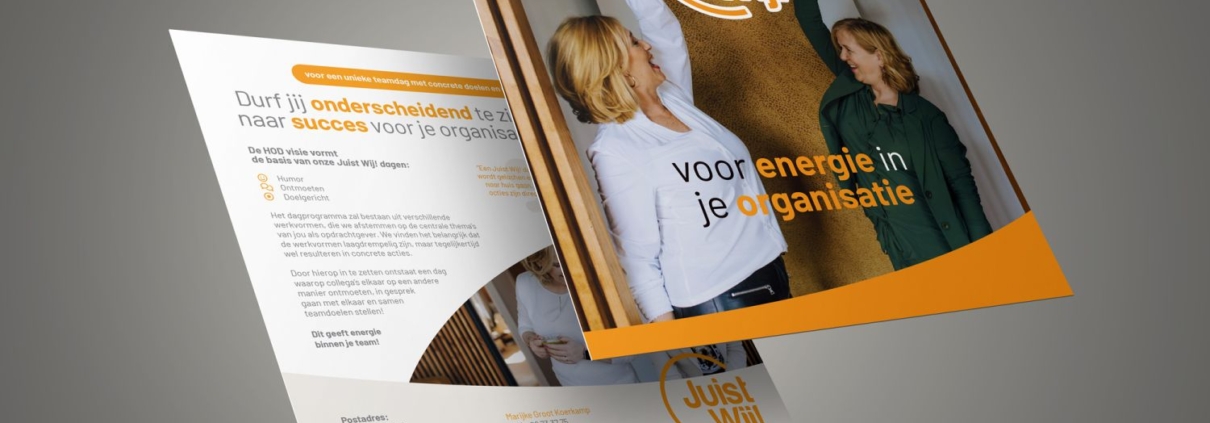 Durf jij onderscheidend te zijn en de stap naar succes voor je organisatie te maken? Bij lekker in vorm mochten we voor JuistWij! deze bondige corporate flyer ontwerpen om mensen te enthousiasmeren voor een teamdag met resultaat. Handig om als reminder mee te geven op bijvoorbeeld beurzen en teamdagen zelf.