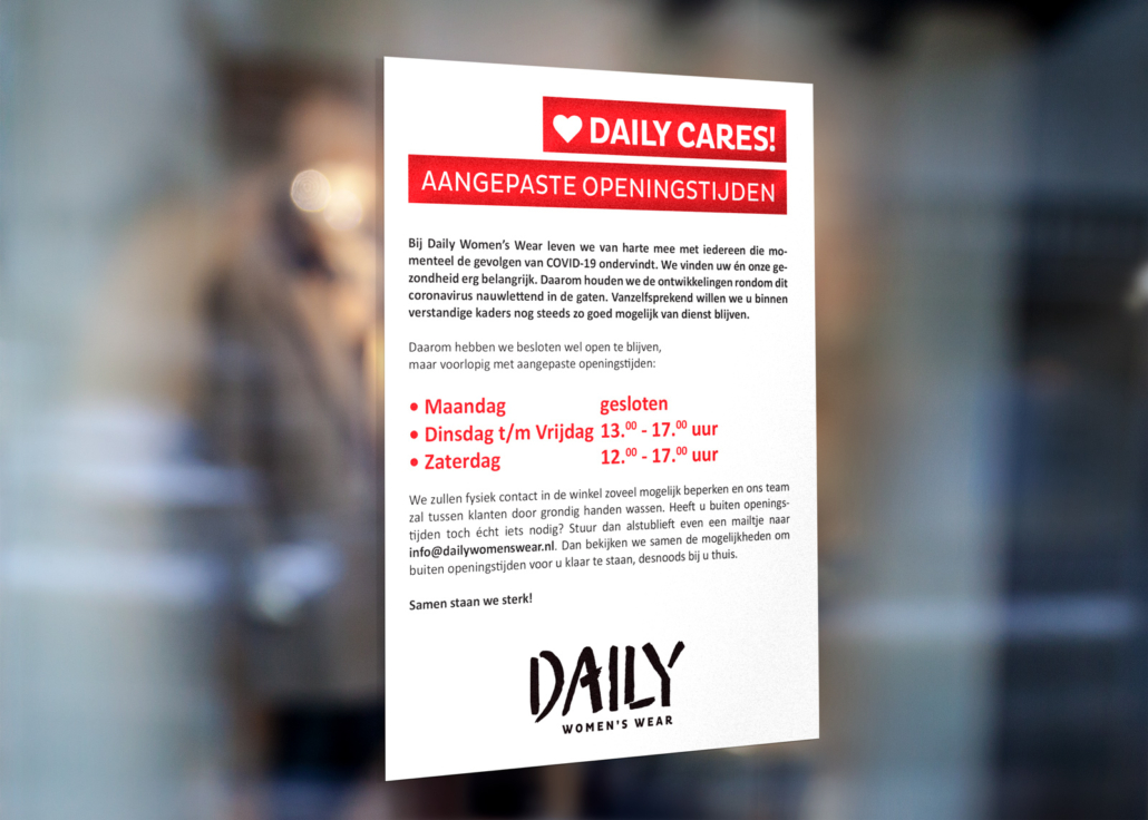 Daily Women’s Wear houdt de ontwikkelingen rondom coronavirus Covid-19 nauwlettend in de gaten en blijft actief communiceren met haar achterban over de actuele stand van zaken. Bij lekker in vorm mogen we de damesmodewinkel bijstaan met passende teksten in de diverse fases van de crisis. We zorgden onder andere voor berichtgeving op social media en in de winkel over genomen maatregelen en aangepaste openingstijden. De raamposters zijn bij uitzondering wit in plaats van zwart, zodat het team ze makkelijk zelf kan printen.