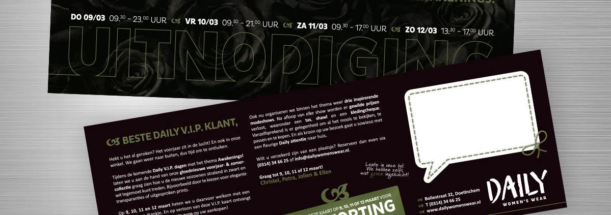 Het voorjaar zit in de lucht bij Daily Women’s Wear. We gaan met z’n alleen weer naar buiten, dus tijd om te “ontluiken”. Vandaar het thema “Awakenings” voor deze editie van de Daily V.I.P dagen. lekker in vorm verzorgde de ontwerpen en teksten, in de vorm van een uitnodiging, stoepbord en save a seat nieuwsbrief.
