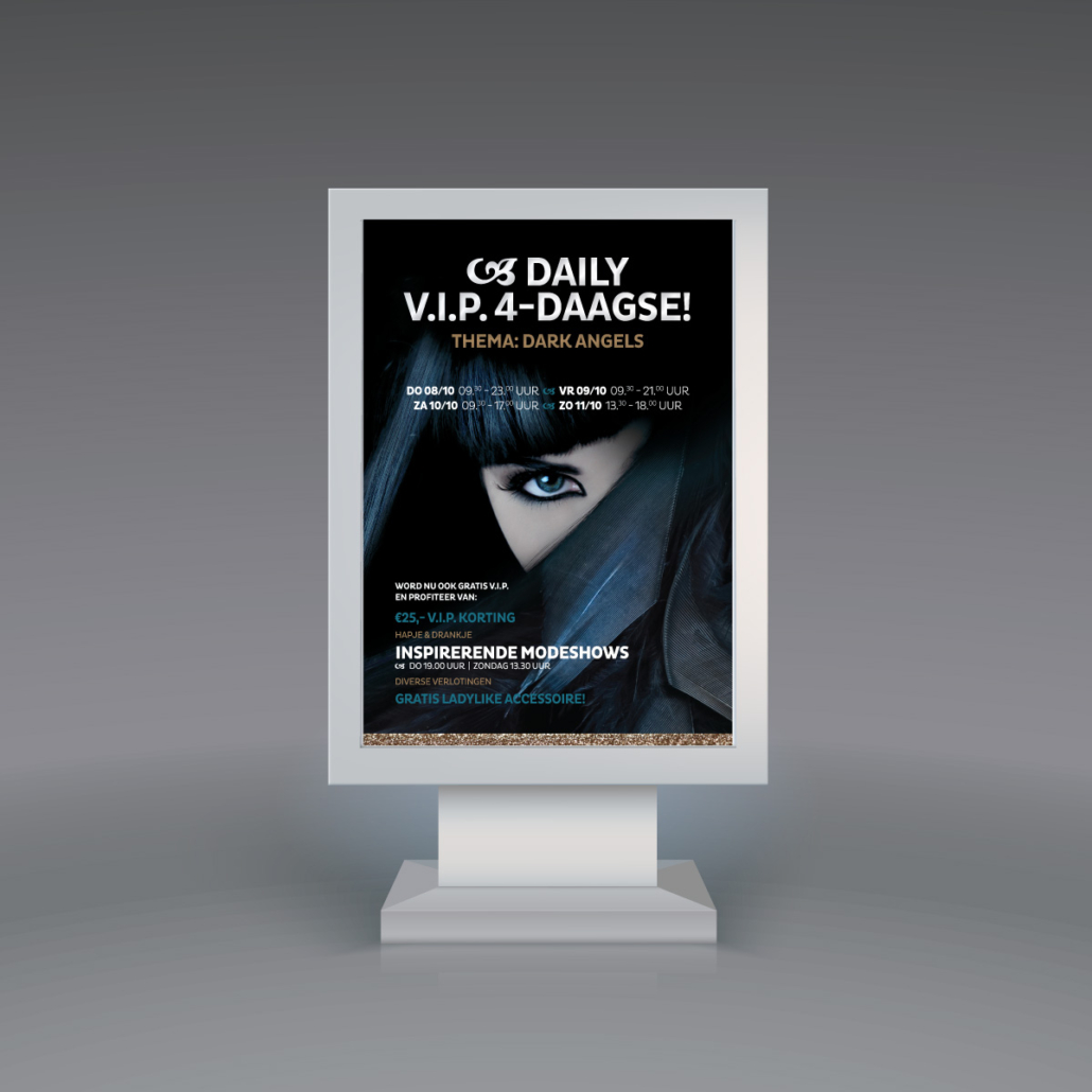 lekker in vorm mocht ook dit najaar weer de ontwerpen en teksten verzorgen voor de Daily V.I.P. dagen, in de vorm van een uitnodiging c.q. kortingskaart en een stoepbordposter, passend binnen het thema ‘dark angels.’ De Daily V.I.P. dagen, met een hapje en een drankje en diverse modeshows, werden uiteindelijk goed bezocht en door klanten hoog gewaardeerd.