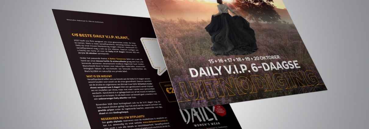 Ze gaan door ondanks Covid-19, maar dan in een nieuw jasje: de Daily V.I.P. dagen. Onder het passende thema A Better Tomorrow laat het team van Daily Women’s Wear aan de hand van de nieuwe herfst- & wintercollectie graag zien hoe je komende seizoenen verantwoord modieus tegemoet kunt treden. Bijvoorbeeld door te kiezen voor natuurlijke materialen, waaronder biologisch katoen en eco-breisels van bewuste modemerken.