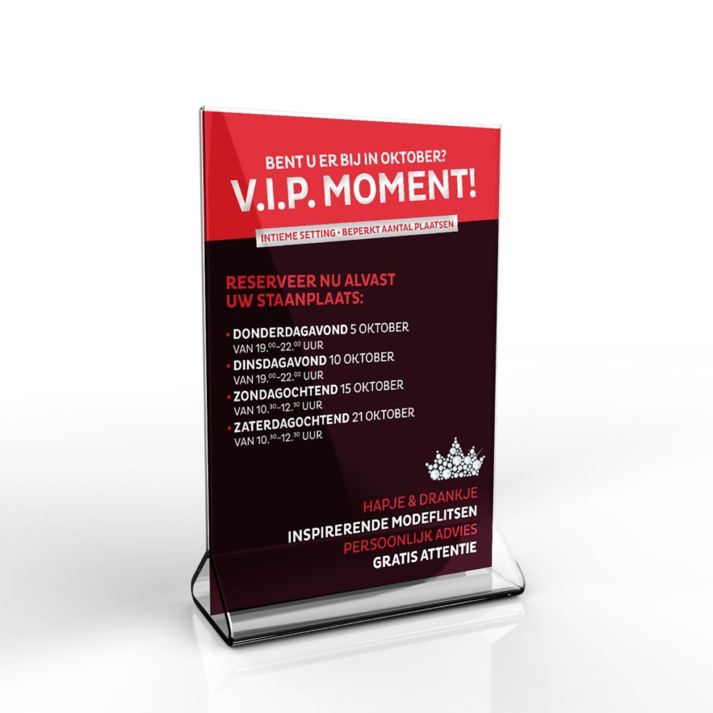 Bij lekker in vorm mochten we er weer een uitgesproken campagne voor ontwikkelen, met o.a. een uitnodiging / directe mailing via de post, een baliedisplay ter aankondiging van de VIP-momenten., diverse nieuwsbrieven, berichten op de website en op social media.