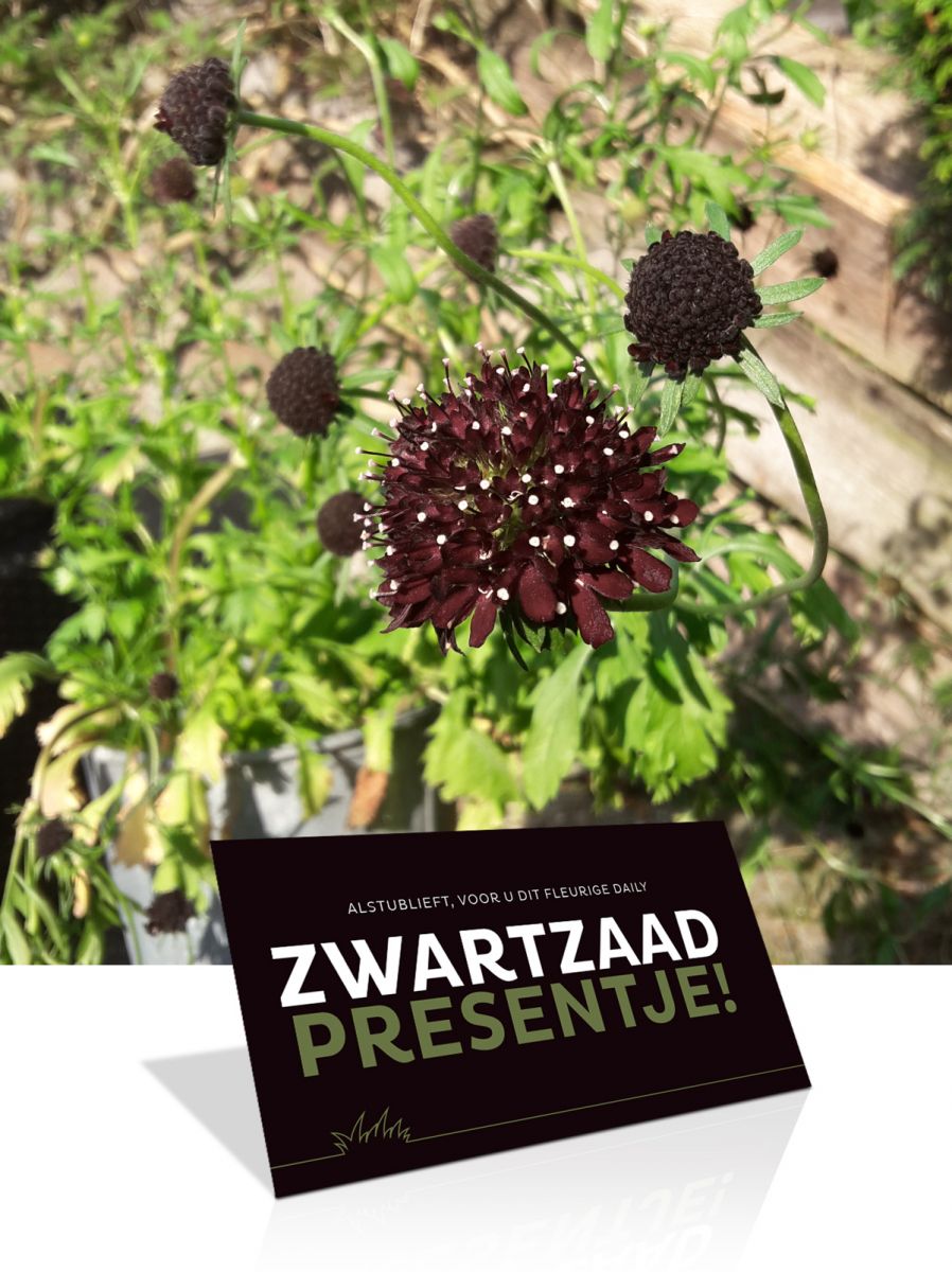Tijdens de “Awakenings” V.I.P dagen ging je als bezoeker bij Daily Women’s Wear naar huis met een passend cadeau: Het Zwartzaad Presentje, bestaande uit een zakje met zaden van de Scabiosa Atropurpurea ‘Black Knight’ en een waardebon t.w.v. 10% korting voor wanneer de bloem in bloei staat. lekker in vorm dacht mee over dit concept en mocht daarna vanzelfsprekend het artwork verzorgen. Oh, en natuurlijk hadden we ook braaf een exemplaar in de achtertuin!