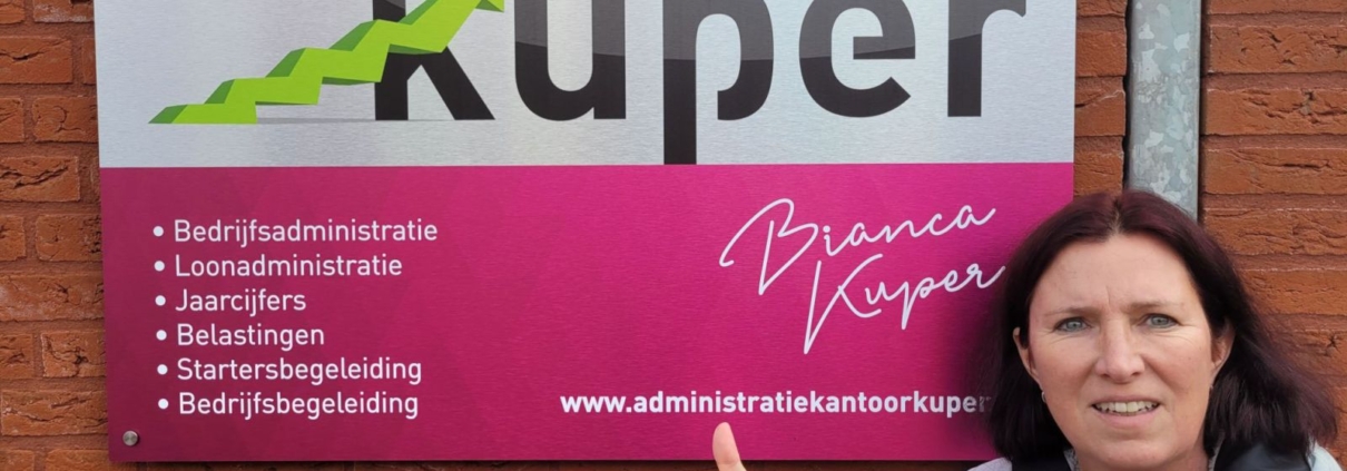 Voor Bianca van Administratiekantoor Kuper mochten we bij lekker in vorm een mooi deurbord ontwerpen, met extra dekwit direct geprint op Alubond en geplaatst op afstandhouders. Zo valt ze stijlvol maar lekker op in de straat!