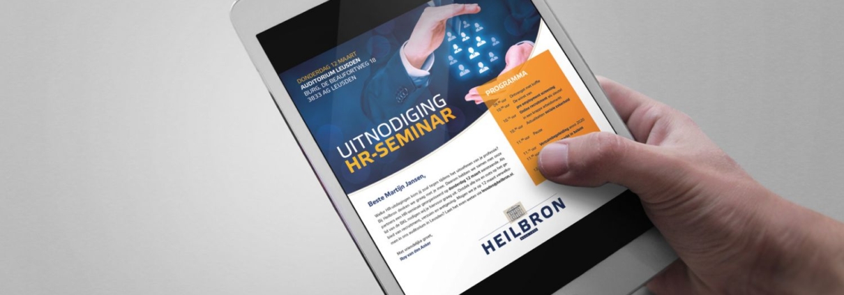 Heilbron Leusden heeft onlangs een HR-seminair georganiseerd met alle ins en outs op het gebied van recruitment, verzuim en wetgeving. Bij lekker in vorm mochten we er deze digitale, gepersonaliseerde uitnodiging voor schrijven en ontwerpen.