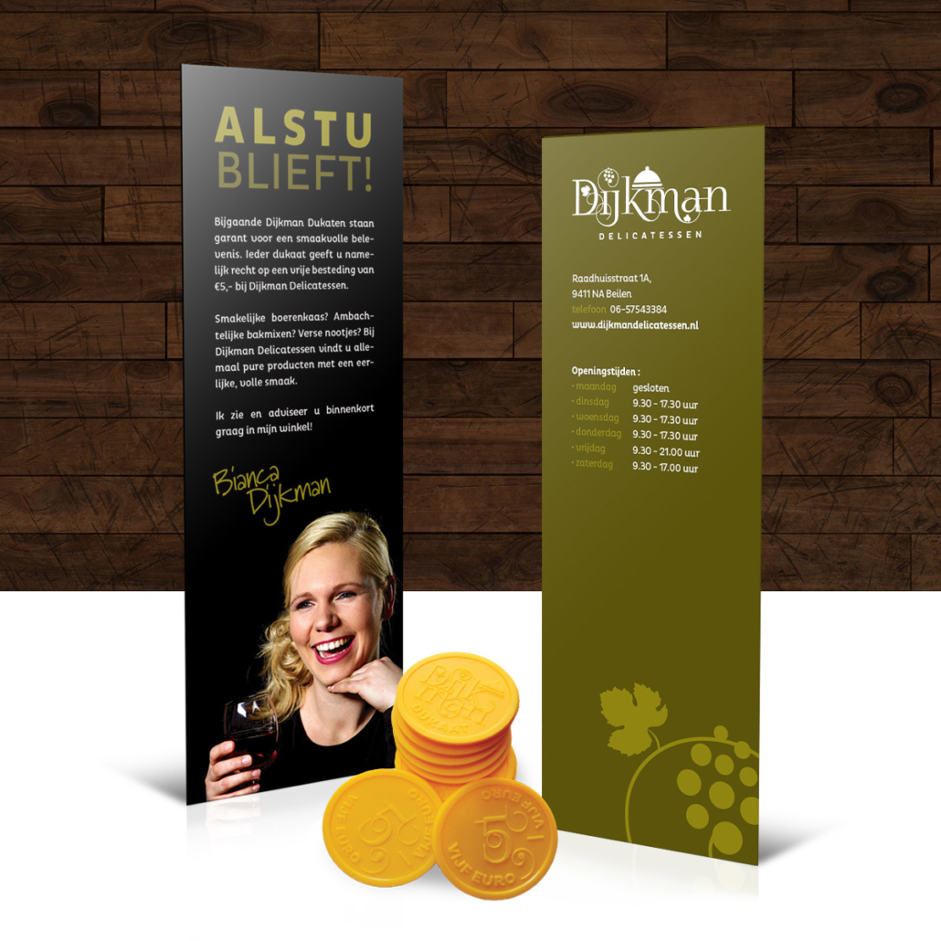 Dijkman Delicatessen wilde – zeker met de feestdagen in het vooruitzicht – beschikken over cadeaubonnen. lekker in vorm dacht buiten kaders en kwam met een alternatief: de Dijkman Dukaat. Een slijtvaste en dus herbruikbare munt met een waarde van €5,-. Zo kan de gever zelf het totaalbedrag bepalen en kan de uiteindelijke ontvanger het cadeau spreiden over meerdere aankopen. Een begeleidend schrijven maakt duidelijk hoe het systeem werkt.