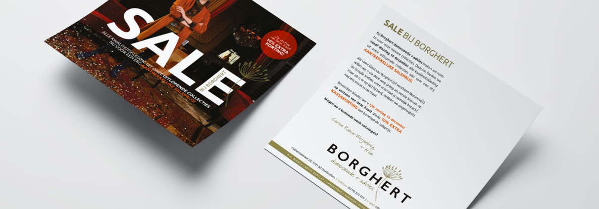 Om vaste klanten van Borghert (of voorheen Remmelink Mode) als eerste op de hoogte te stellen van de sale, ontwierpen en schreven we bij lekker in vorm een mooie direct mailingkaart.