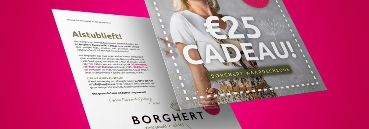 Het wordt weer heerlijk buitenweer. Daarom heeft Borghert damesmode + advies de winkel gevuld met prachtige lentekleding! Om vaste klanten te bedanken voor de moeite om ondanks de coronamaatregelen naar de winkel te komen, trakteert Borghert hen bij inlevering van deze kaart op €25,- korting! Bij lekker in vorm mochten we de waardecheque vormgeven, schrijven, drukken en verzenden.