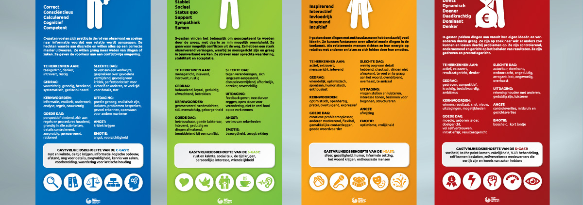 Wat voor een type gast ben jij? Opvliegend? Sfeergevoelig? Of graag het bruisende middelpunt? Het op maat gemaakte DISC systeem van Gastvrijheid in Bedrijf maakt de diverse gasttypes gemakkelijk inzichtelijk. lekker in vorm mocht deze set ontwerpen van 4 roll-up-banners die als ondersteuning bij de DISC gastvrijheidstrainingen ingezet worden.