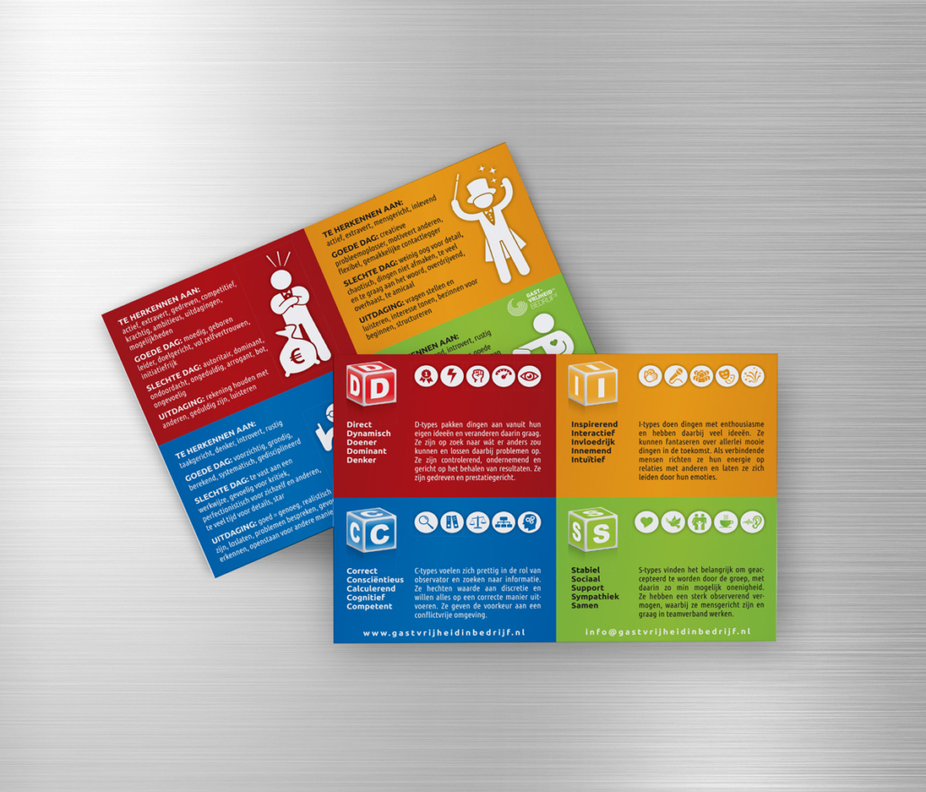 Wat voor een type gast ben jij? Opvliegend? Sfeergevoelig? Of graag het bruisende middelpunt? Het op maat gemaakte DISC systeem van Gastvrijheid in Bedrijf maakt de diverse gasttypes gemakkelijk inzichtelijk. lekker in vorm mocht deze set ontwerpen van 4 roll-up-banners die als ondersteuning bij de DISC gastvrijheidstrainingen ingezet worden.