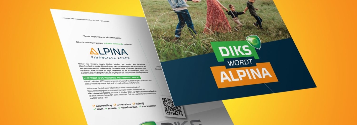 Diks Verzekeringen gaat per 1 oktober 2022 verder onder de nieuwe naam Alpina en biedt voortaan alle financiële dienstverlening onder één dak aan: van verzekeringen tot hypotheken en van pensioenen tot makelaardij. Om klanten hierover te informeren mochten we bij lekker in vorm een direct mailingkaart ontwerpen die de bekende elementen van Diks alvast combineert met de nieuwe elementen van Alpina.