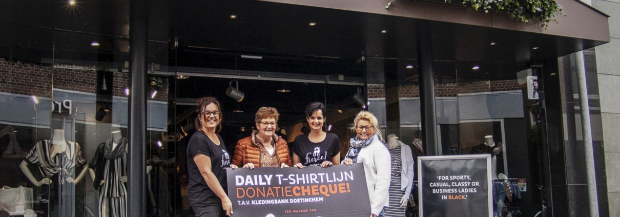 Kledingbank Doetinchem mocht deze week een donatiecheque van maar liefst 350 euro in ontvangst nemen uit handen van Daily Women’s Wear. Dit dankzij de succesvolle eigen T-shirtlijn van de damesmodewinkel in samenwerking met ons! Voor elk verkocht shirt uit deze lijn gaat er 10 euro rechtstreeks naar de kledingbank.