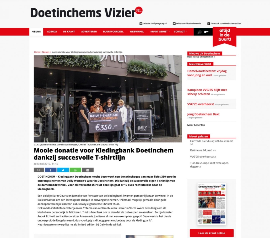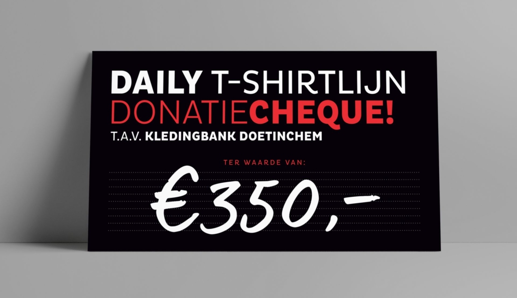 Kledingbank Doetinchem mocht deze week een donatiecheque van maar liefst 350 euro in ontvangst nemen uit handen van Daily Women’s Wear. Dit dankzij de succesvolle eigen T-shirtlijn van de damesmodewinkel in samenwerking met ons! Voor elk verkocht shirt uit deze lijn gaat er 10 euro rechtstreeks naar de kledingbank.