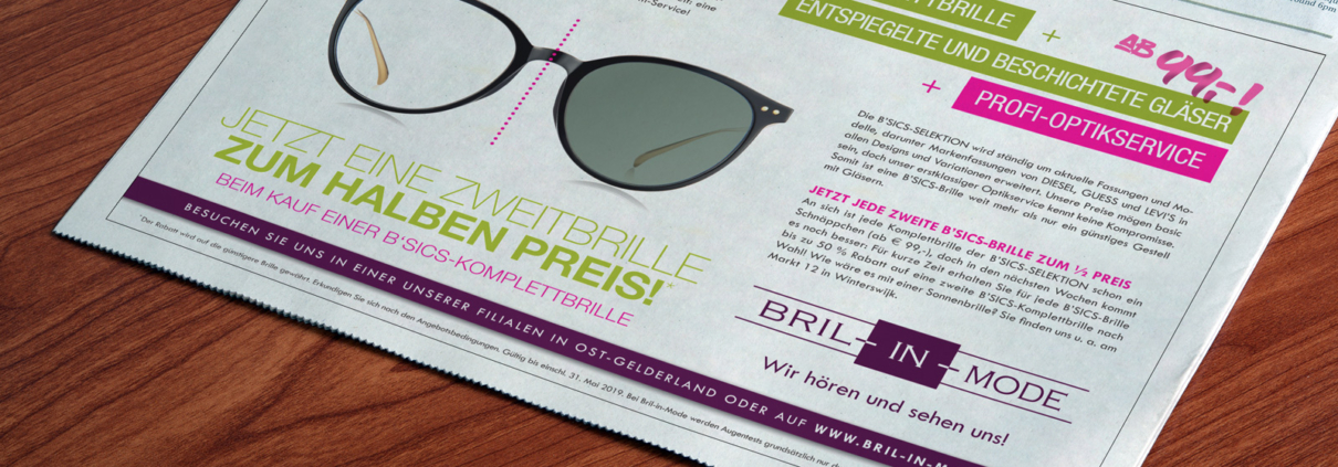 De B’SICS collectie van Bril-in-Mode is ook populair in Duitsland. Daarom mochten we bij lekker in vorm deze duitstalige advertentie ontwerpen voor de uitgave 100% Winterswijk. Naast de vormgeving verzorgden we ook de vertaling via een native speaker.