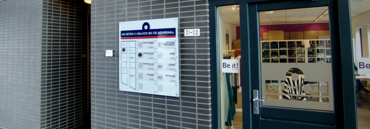 Wij en onze buren zijn voortaan goed vindbaar, dankzij dit logobord in de entree, door ons verzorgd voor bedrijfsverzamelgebouw De Admiraal Doetinchem. Het bord zelf is uitgevoerd in mooi dik plexiglas en de huurders worden aangeduid via statische bestickering.