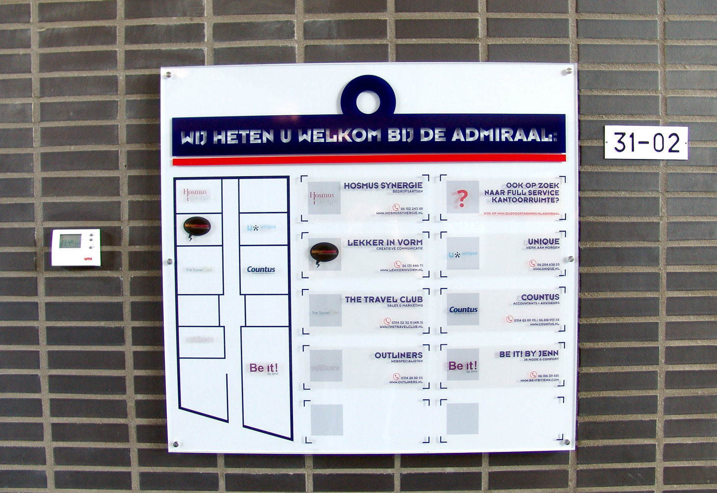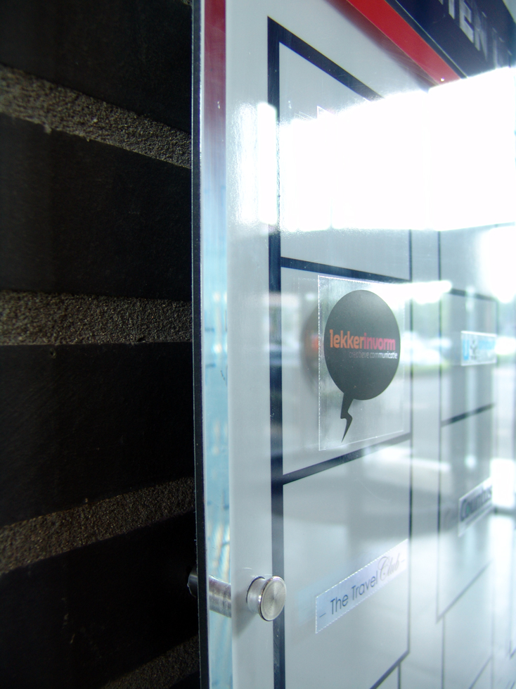 Wij en onze buren zijn voortaan goed vindbaar, dankzij dit logobord in de entree, door ons verzorgd voor bedrijfsverzamelgebouw De Admiraal Doetinchem. Het bord zelf is uitgevoerd in mooi dik plexiglas en de huurders worden aangeduid via statische bestickering.
