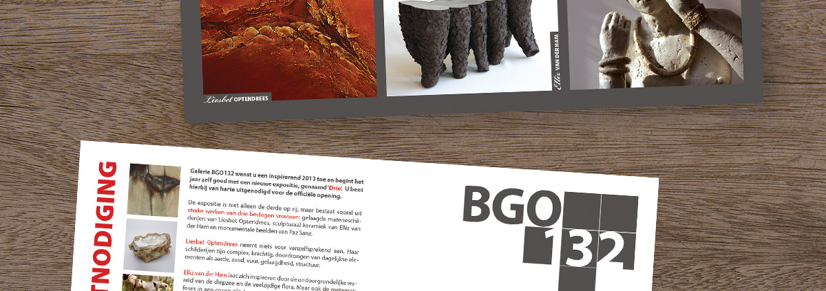 Expositie ‘Drie’ van BGO132 is niet alleen de derde op rij, maar bestaat vooral uit sterke werken van drie bevlogen vrouwen: gelaagde materieschilderijen van Liesbet Optendrees, sculpturaal keramiek van Elliz van der Ham en monumentale beelden van Paz Sanz. lekker in vorm ontwierp de uitnodigingen en afgeleide posters en verzorgde de fotografie tijdens de officiële opening.