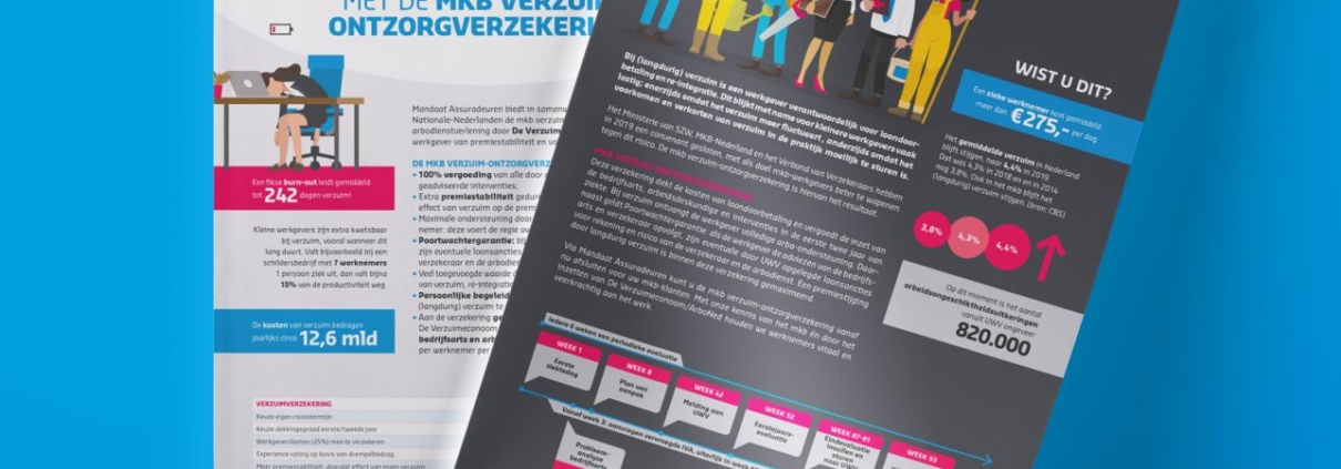 Financieel adviseurs kunnen via Mandaat voortaan een speciale MKB verzuim ontzorgverzekering aanbieden aan zakelijke klanten. Bij lekker in vorm mochten we er een sprekende infosheet voor opmaken. Door middel van kleurrijke illustraties, weetjes en grafieken werd de feitelijke informatie prettig leesbaar gemaakt.