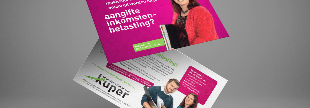 Administratiekantoor Kuper vult jaarlijks graag je aangifte inkomstenbelasting snel en vakkundig voor je in. Bij lekker in vorm mochten we een huis-aan-huis flyer schrijven en ontwerpen die dit bij consumenten in de regio onder de aandacht brengt. Met de aantrekkelijke instapkorting is dat het eerste jaar extra aanlokkelijk.