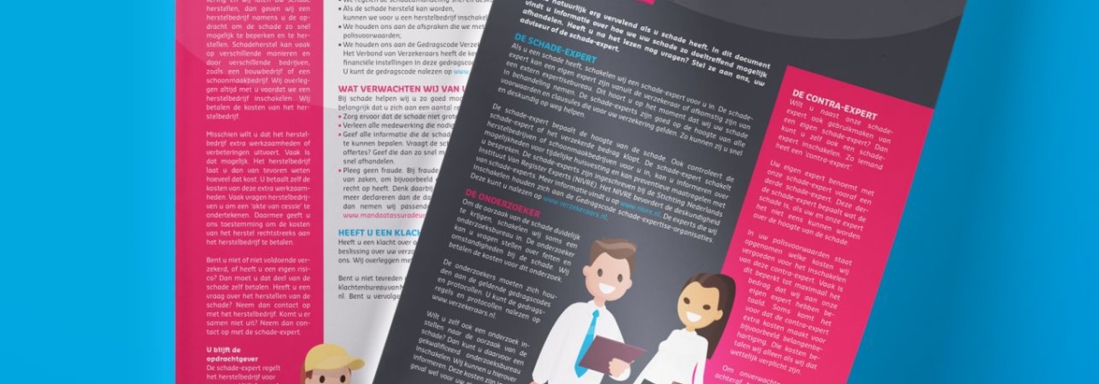 Schade is al vervelend genoeg! Daarom mochten we bij lekker in vorm in opdracht van Mandaat deze overzichtelijke flyer ontwerpen om klanten zo doeltreffend mogelijk te informeren over wat er komt kijken bij de schadeafhandeling.