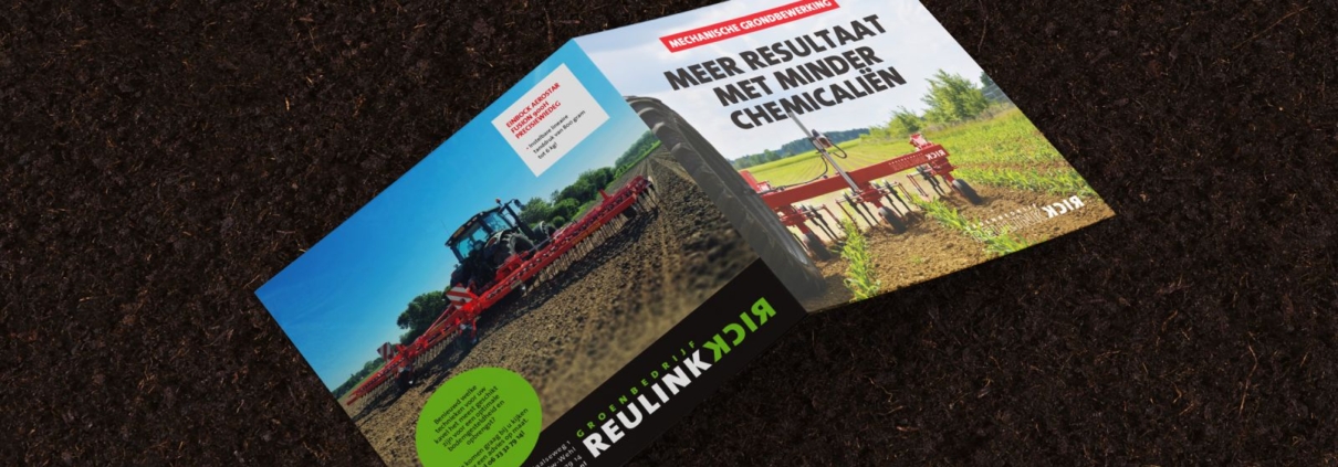 Voor Groenbedrijf Rick Reulink mochten we bij lekker in vorm een folder maken voor de nieuwe tak van sport: mechanische grondbewerking! Door de positieve effecten van schoffelen en wieden te koppelen aan de technologische kennis anno nu zijn deze methoden in veel gevallen volwaardige alternatieven voor chemische bestrijdingsmiddelen. Vandaar de titel “Meer resultaat met minder chemicaliën”. Om het verhaal af te maken, lieten we deze folder drukken op papier van 100% gerecyclede vezels.