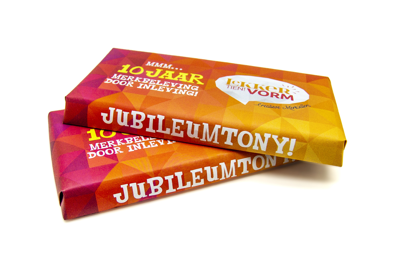 We zijn zelf verzot op chocolade, dus een smakelijke give-away voor tijdens ons jubileumjaar was snel gevonden in de vorm van een op maat gemaakte reep Tony’s Chocolonely. We mochten bij uitzondering zelfs het huisstijllettertype van de chocoladeproducent gebruiken voor onze eigen Jubileumtony!