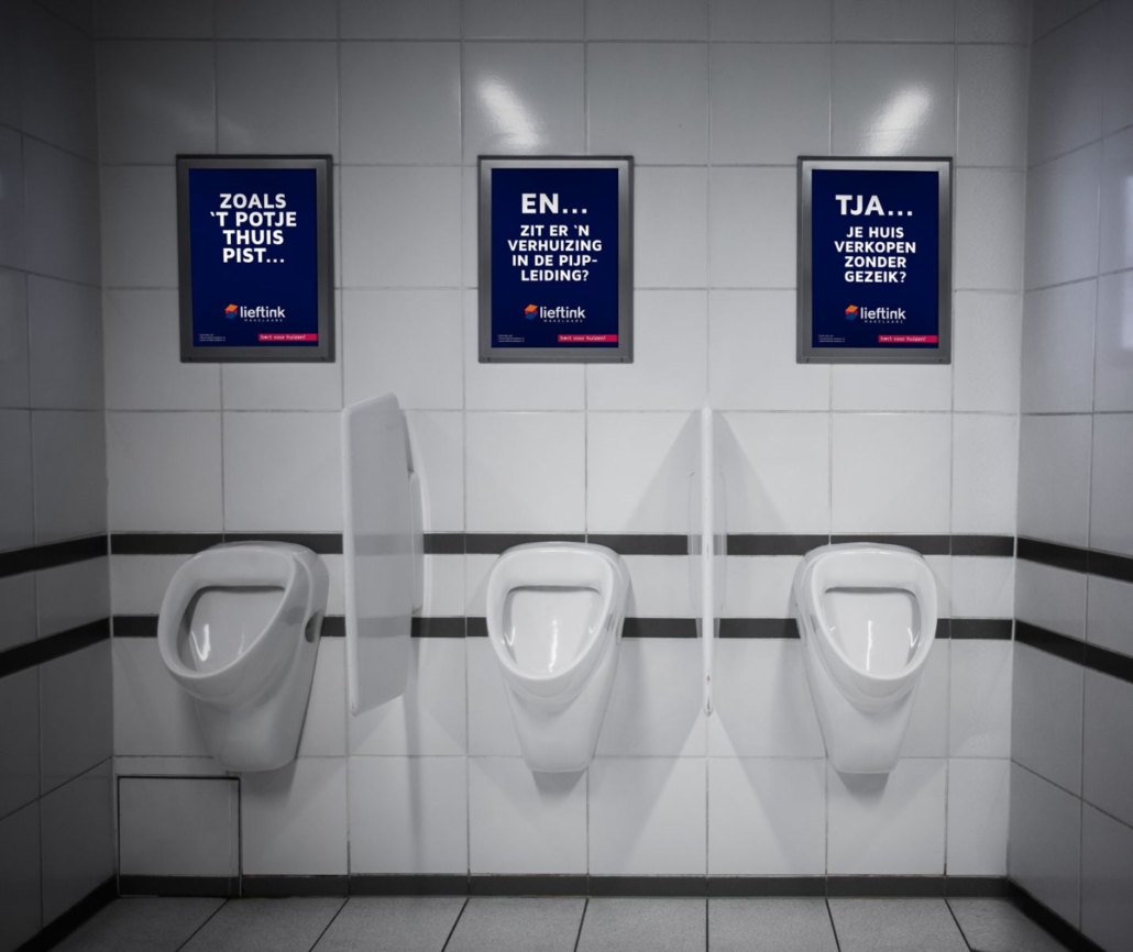Om Lieftink Makelaars op een ludieke manier zichtbaar te maken in en rond Zelhem, mocht lekker in vorm enkele posters met oneliners ontwikkelen. Sommige daarvan zijn terug te vinden tussen het huizenaanbod in de etalage van Lieftink, voor andere moet je even het toilet bezoeken van de plaatselijke horeca.