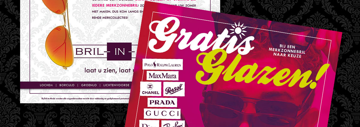 Ga scherp de zomer in en profiteer in mei, juni en juli van glashard zonvoordeel bij Bril-in-Mode: gratis glazen op sterkte bij iedere merkzonnebril. lekker in vorm ontwierp een huis-aan-huisflyer en bijpassend pos-materiaal voor deze zinderende actie.