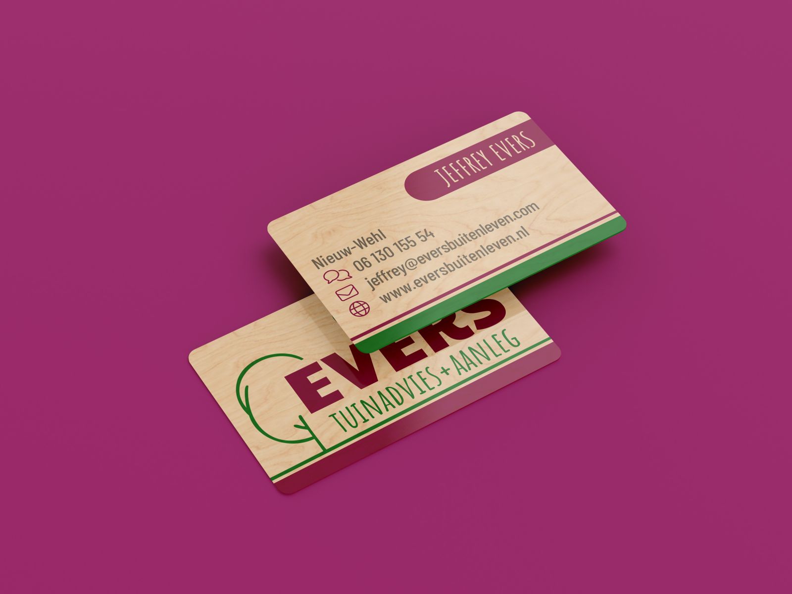 Voor hovenier Evers Buitenleven mochten we bij lekker in vorm deze houten visitekaartjes ontwerpen. Niet alleen een goede uitstraling, maar ook makkelijk uit te delen met vieze tuinvingers!